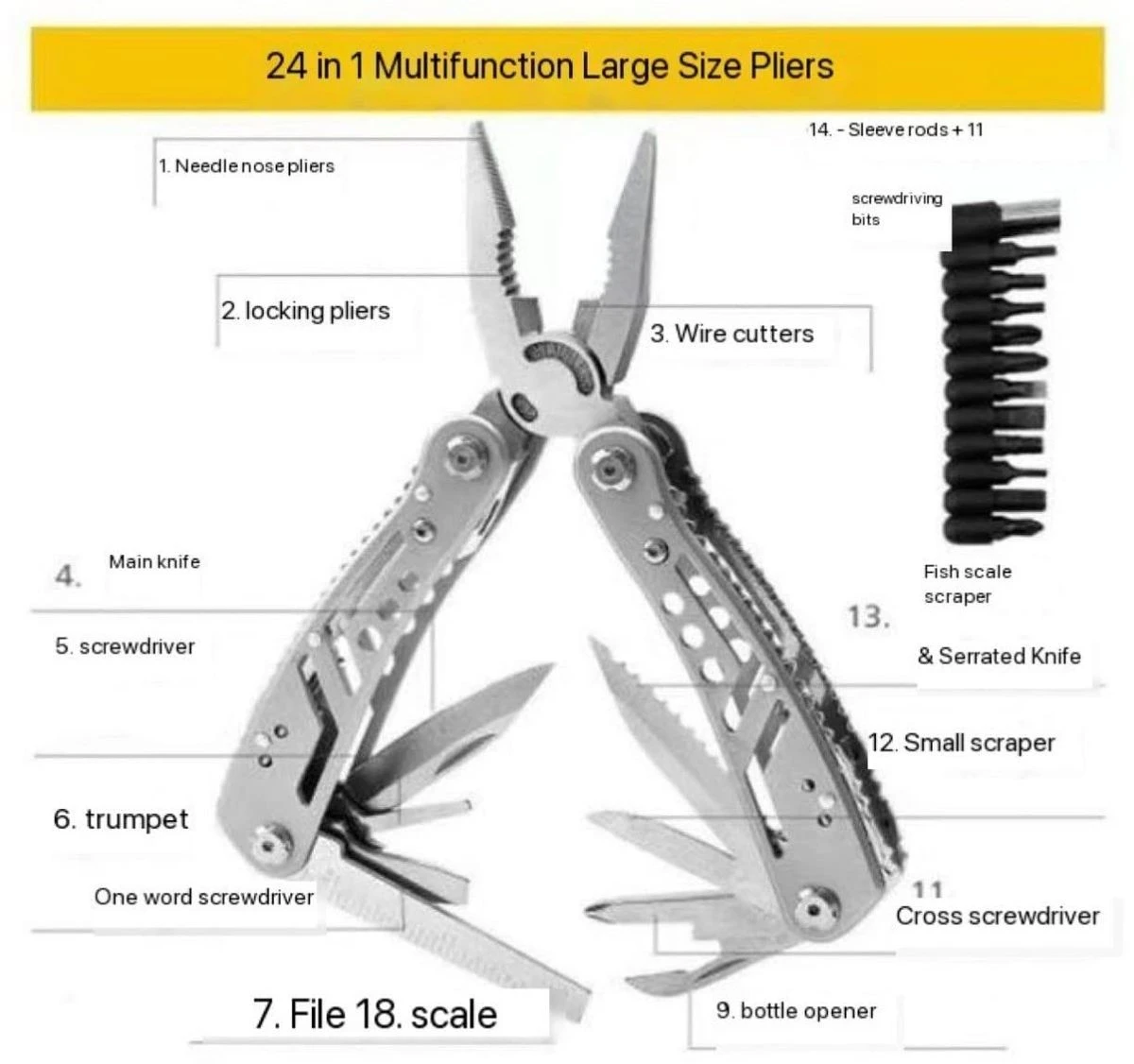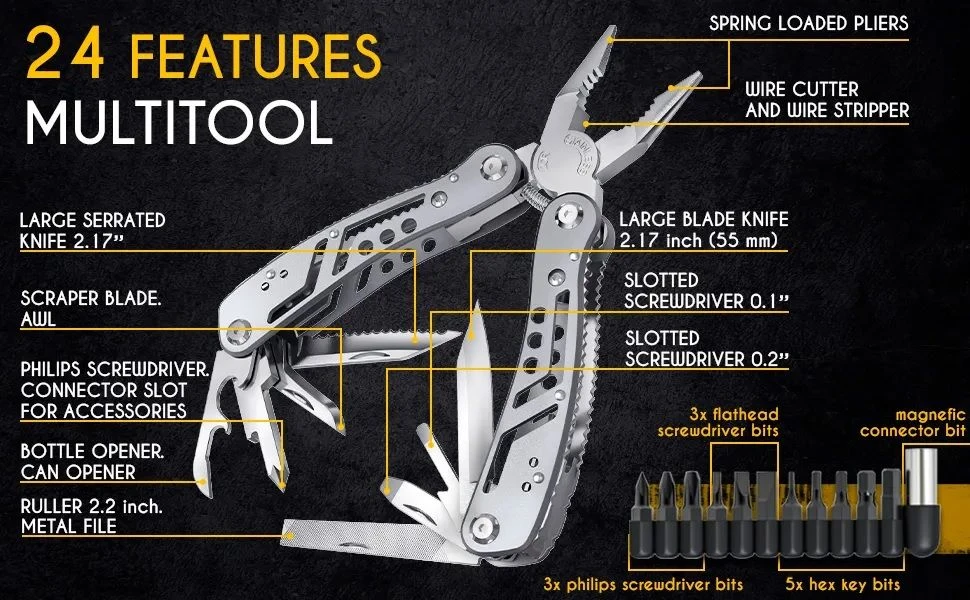 LIGHTWEIGHT MULTITOOL 24 FEATURES - pliers electrician wire cutter and stripper folding knife can and bottle opener metal file screwdrivers 11 bits with magnetic connector scraper and awl. It is a true multifunction utility tool. COMPACT MULTIFUNCTION ALL IN ONE TOOL for Camping, Hiking, Backpacking, Hunting, Fishing. EDC and Boy Scout Tools. It is easy to use multi tool as a car or bike repair tools pliers. MADE OF HIGH-QUALITY STAINLESS STEEL. Compact size and lightweight design make it easy to keep all in one multi tool pocket knife in your pocket. Skeleton design accessory. COMES WITH A NYLON SHEATH which makes it possible to carry the multitool on. Belt knife. Multitool can also be carried in a pocket, purse or a backpack. Lightweight gear, accessories for EDC. Length Overall: 16.0 cm Carry System: Heavy-duty nylon pouch. Material: Stainless steel Blade Material: 440 C Stainless steel Hardness: 57HRC What's in the box: 1 x Pliers Multi Tool Set 1 x Nylon Pouch 1 x Box What's in the box 1 x Pliers Multi Tool Set 1 x Nylon Pouch 1 x Box |