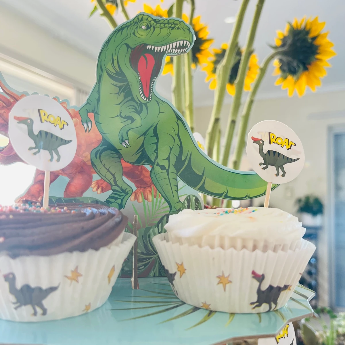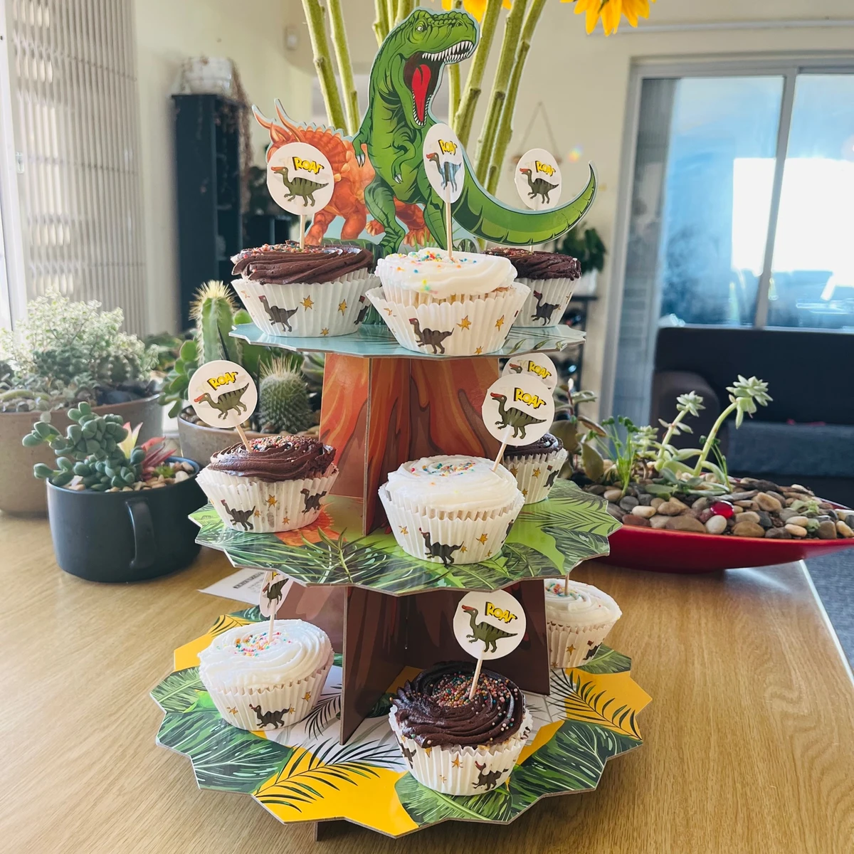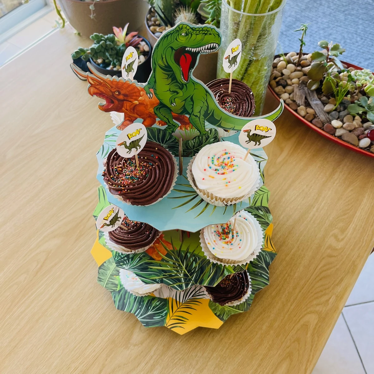 Perfect finishing touch to your birthday or Pre-historic party! Easy to assemble and disassemble, this cupcake holder can be reused again and again with the same elegance and convenience to showcase your home cooked treats, tea time delights, appetizers, and other gourmet items. Hard-wearing cardboard surface can be easily wiped cleaned with damp cloth to give this stand a fresh new look for presenting your delicacies multiple times. Additional Information: Cupcakes it can hold: - Top Tier: 6 - Middle Tier: 12 - Base Tier: 16 - Stand Size 38cm - Board Thickness: 2mm - Easy to disassemble for storage - Can wipe with a lightly damp cloth - Enable to carry from the top for easy moving - Plates: 3x Round plates - Perfect use for a baby showers, parties, bakeries, food display, graduation parties, and holidays. - Uses: Cupcakes, muffins, pastries, desserts, appetizers, fruits, brownies, and party treats! What's in the box 1 x 3 Tier Dinosaur Cupcake Stand |