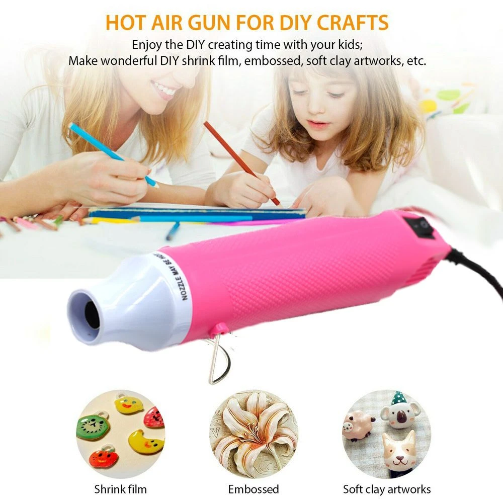 Features: - With ABS material outside and stainless steel inside, this hot air gun is simple and more durable. - Built-in stand for self-support and tabletop use, a good tool for ceramic creations. - Heat up quickly: The temperature can't be adjusted but it heats up quickly. It can reach at about 200°C/390°F within a few seconds. - The heat vents designed in both tail sides to reduce the internal temperature and extend the product duration. - Mini hot air gun is a perfect tool for DIY craftworks. It can be used for embossing powder, heat-shrinkable film, clay, bump, rubber stamp, fast-drying paint, glue, catalytic adhesive bonding, rapid thawing, shrink PVC for packaging, seal wax patterning, DIY handmade soap or candle. Specifications: - Material: Stainless steel + ABS - Color: Pink - Voltage: 220V - Plug type: EU plug - Working temperature: About 200°C / 390°F - Power type: AC power supply - Power: 300W - Length: 22.5cm What's in the box 1x Hot Air Gun 1x Manual |