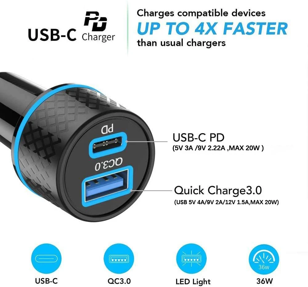 Specifications: - Input: DC 12-24V - USB Output (USB-A): 5V 4A /9V 2A/12V 1.5A - PD Output (USB-C): 5V 3A/9V 2.22A - Output wattage: 36W - Size: 60.5mm Height x 30.5mm Diameter - Weight: 49g Main features: - Intelligent voltage real-time monitoring and protection. - Dual-port USB-A and USB-C allow for simultaneous fast charge of two devices. - LED digital display indicator to know your charging and car status at a glance. - Smart charging chip provides efficient and safe charging: -Short circuit protection. -Voltage overload protection. -Overheating protection. -Current overload protection. -Overload protection. - Supports PPS / QC3.0 / QC2.0 / AFC / SCP & FCP quick charging protocols for the latest devices. What's in the box 1 x Dual USB Car Fast Charger |