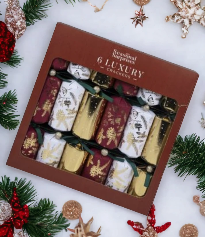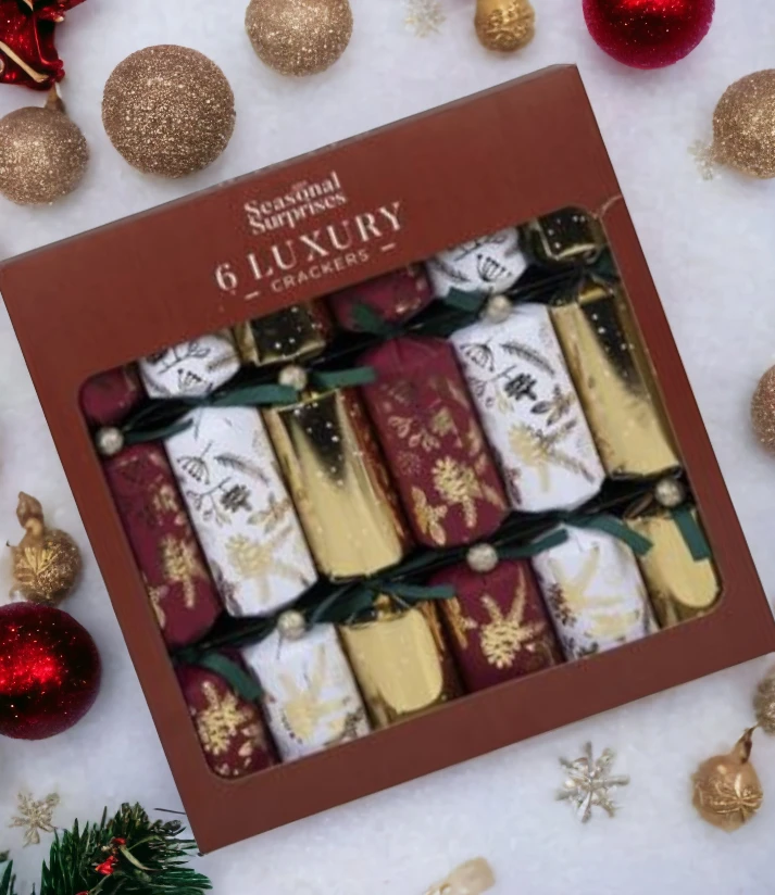 6 Luxury Christmas Holly Crackers 6 Per Crackers Pack 6 Gorgeous Christmas Crackers - a sophisticated and festive addition to your holiday celebrations. These beautifully crafted crackers are designed to bring a touch of elegance and excitement to your Christmas festivities. Key Features: Exquisite Design: Each Christmas cracker in this set is a work of art, featuring intricate patterns, shimmering accents, and festive motifs. Their stunning appearance adds a touch of opulence to your holiday table. Thoughtfully Curated Contents: Inside each cracker, you'll find a selection of delightful surprises. From small trinkets to entertaining jokes or riddles, every element is carefully chosen to bring joy and merriment to your celebrations. Versatile for All Ages: Our Gorgeous Christmas Crackers are suitable for all generations, from children to adults. They make a wonderful addition to family gatherings, festive dinners, or any holiday event where a touch of magic and fun is desired. Perfect for Gifting: These Gorgeous Christmas Crackers make for a thoughtful and delightful gift. Whether for family, friends, or as a special touch for your holiday host, they're sure to be appreciated and treasured. Elevate your holiday gatherings with our set of 6 Gorgeous Christmas Crackers. Their exquisite design, quality craftsmanship, and curated surprises make them a standout addition to your festive celebrations. Bring a touch of elegance and excitement to your Christmas festivities with these beautifully crafted crackers. What's in the box 1 x Pack of choice |