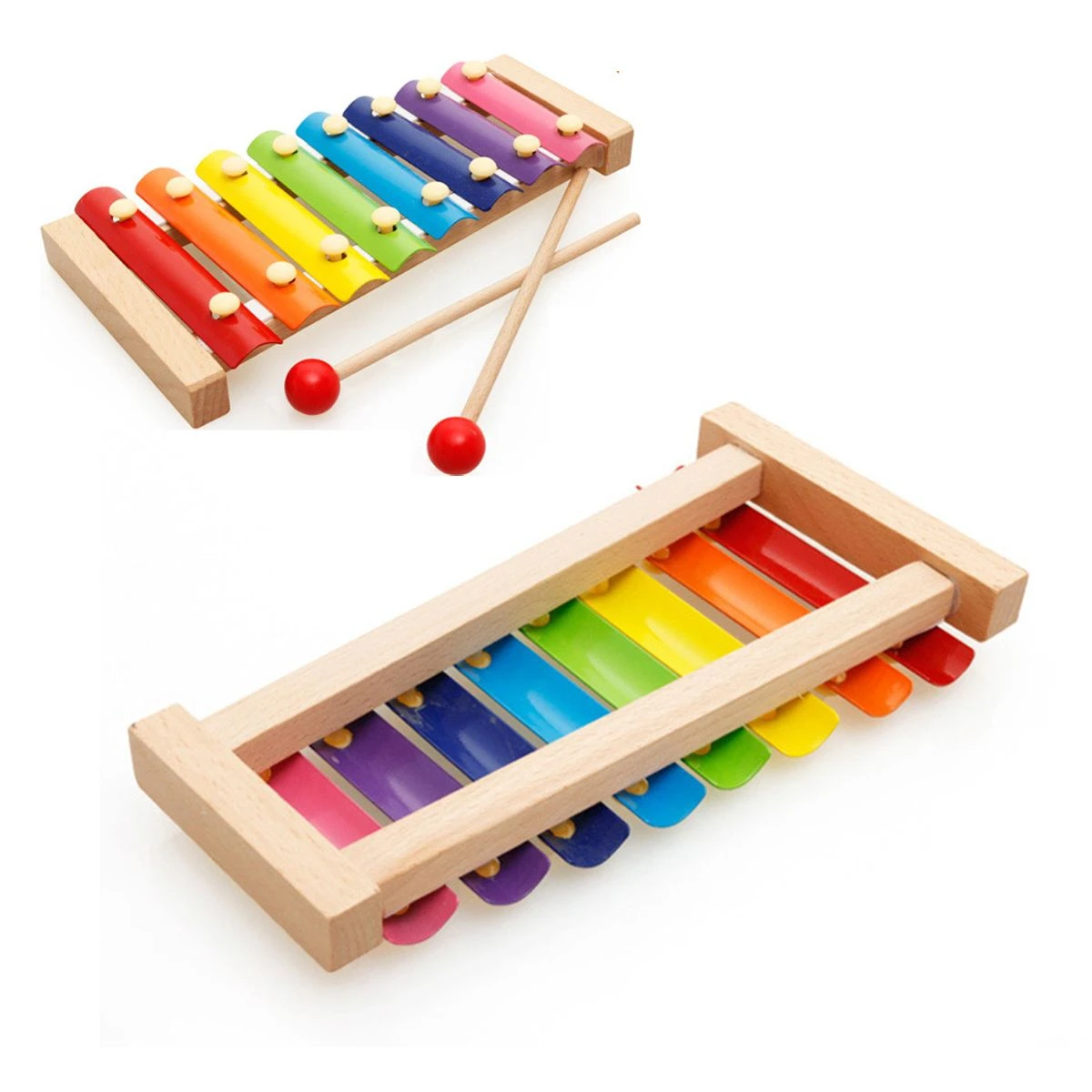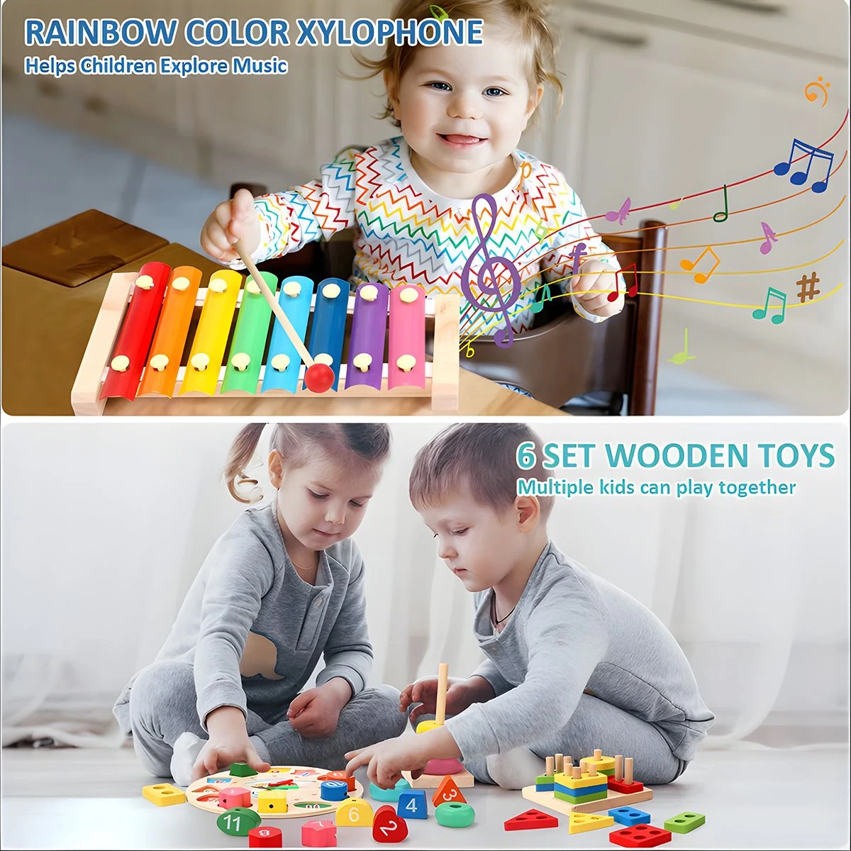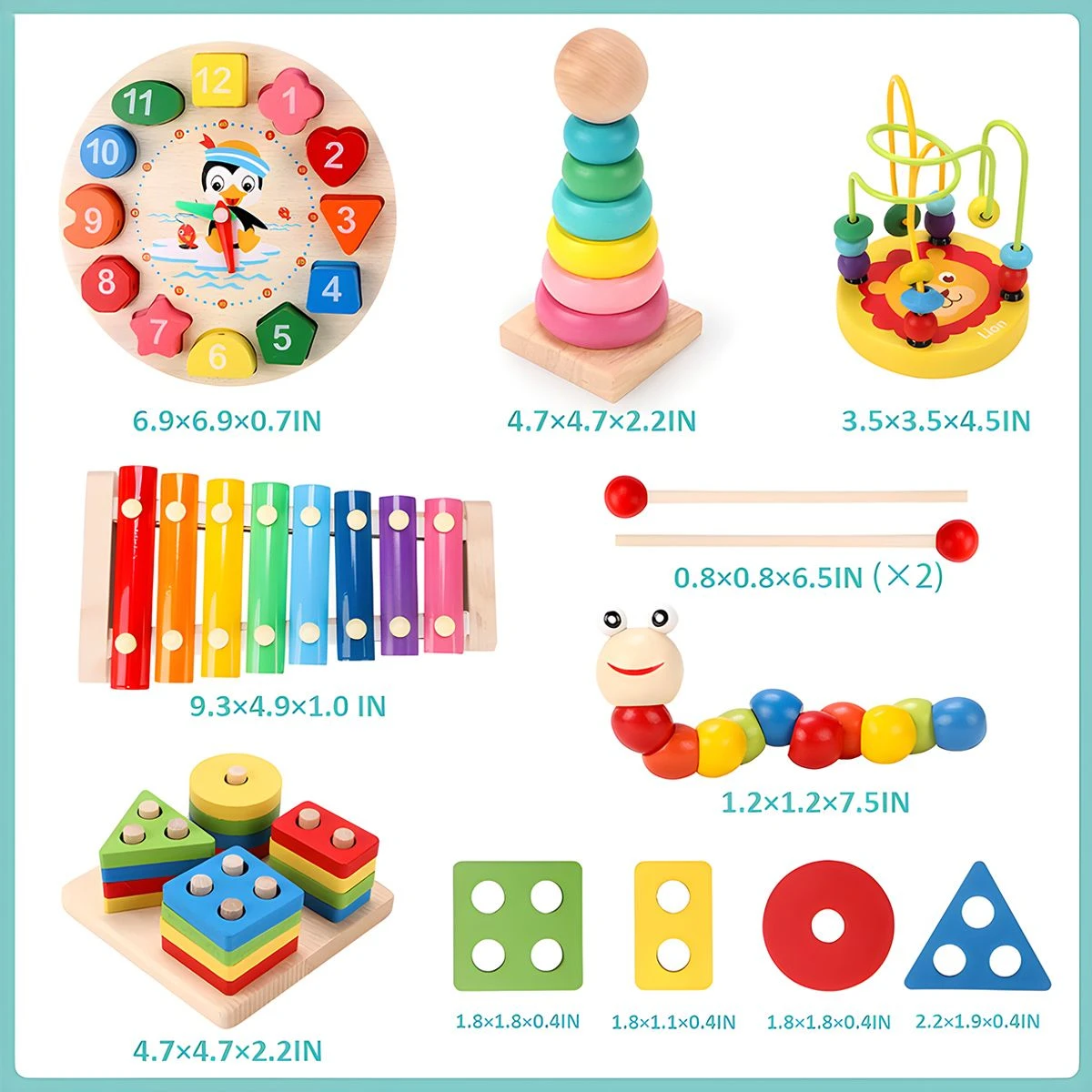 Specifications: - Color: Colorful - Material: wooden Features: - Multifunctional design This set of wooden toys combines multiple functions such as shape sorting, stacking, nesting blocks and xylophones to provide diverse play methods and stimulate children's creativity and imagination. Educationally: This set of toys is designed to help children learn basic concepts such as shapes, colors, and music. Through activities such as shape sorting, stacking and nesting blocks, children can improve their spatial cognition, hand-eye coordination and problem-solving skills. Wood material: These toys are made of wood, safe, non-toxic and environmentally friendly. Wooden materials have natural texture and warmth, which are beneficial to children's hand and tactile development. Musical Instrument: The xylophone in this set of toys allows children to feel the charm of music and cultivate their interest in music and sense of rhythm. Children can use the xylophone keyboard to hit different notes and explore the wonderful world of music. Develop multiple skills: This set of toys can exercise children's fine hand movements, hand-eye coordination and logical thinking skills. Through shape sorting and stacking activities, children can improve their spatial cognition and problem-solving skills. Interactive and Social: This set of toys can promote children's interaction and cooperation with peers or family members. Together they can play shape sorting games, stack and nest blocks, and explore and solve problems together. If there is any problem or you are unsatisfied with our product , just contact us and our service team will solve your problem within 24 hours. What's in the box 1 x Wooden Educational Toys set |