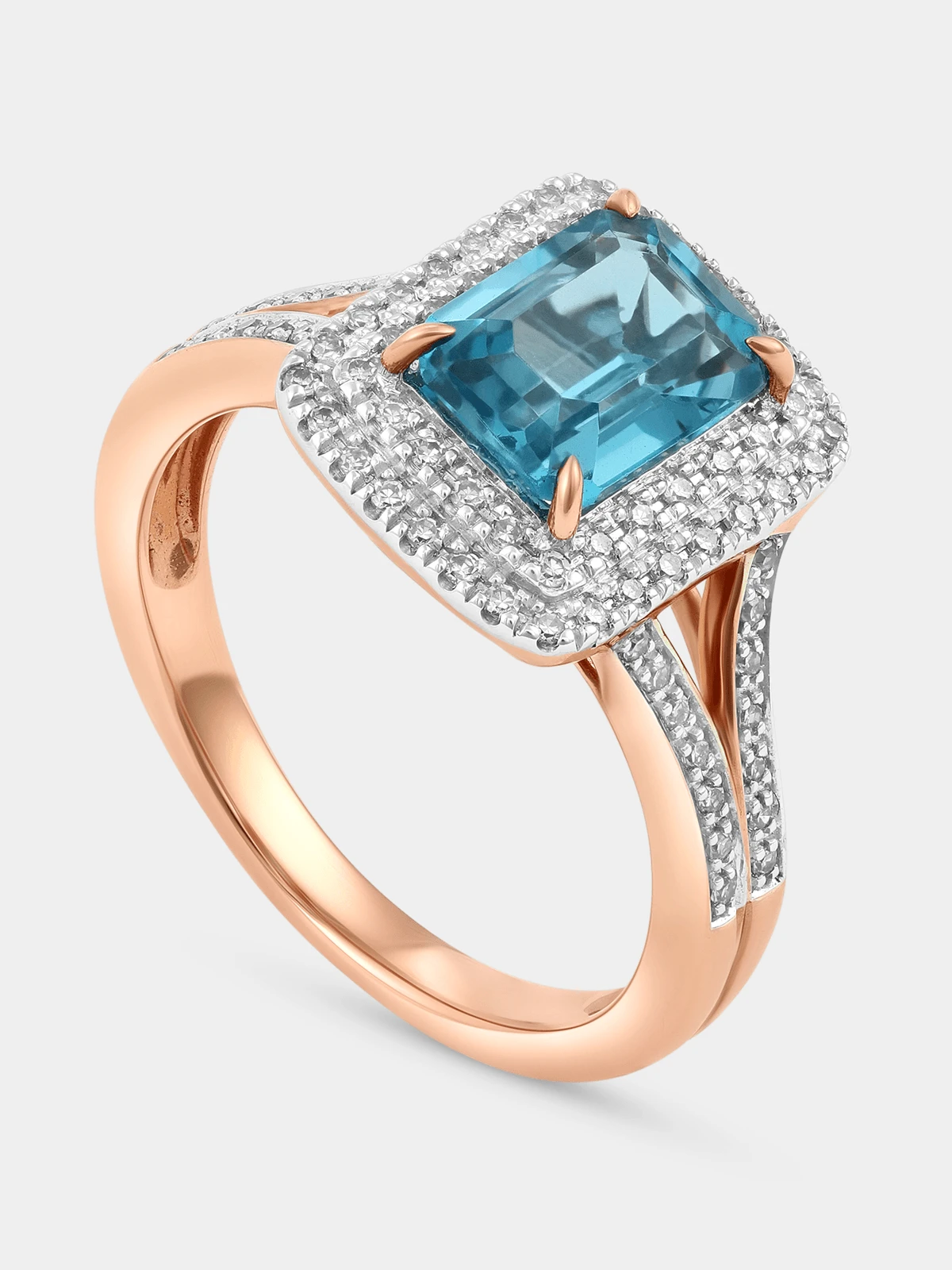The beauty of the emerald-cut blue topaz is beautifully off-set by a double diamond halo and set in 9ct rose gold. 0.28ct total diamond weight Gemstone Diamond Gemstone Topaz Ring size N Metal content 9CT Gemstone quality SELECT Gemstone shape RECTANGLE Metal colour ROSE GOLD Fibre content 100% GOLD Stone colour BLUE Ring sizes N |