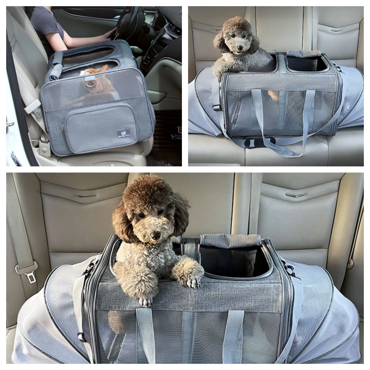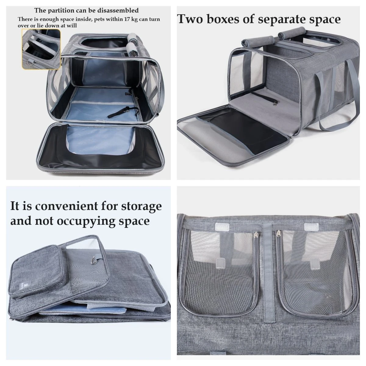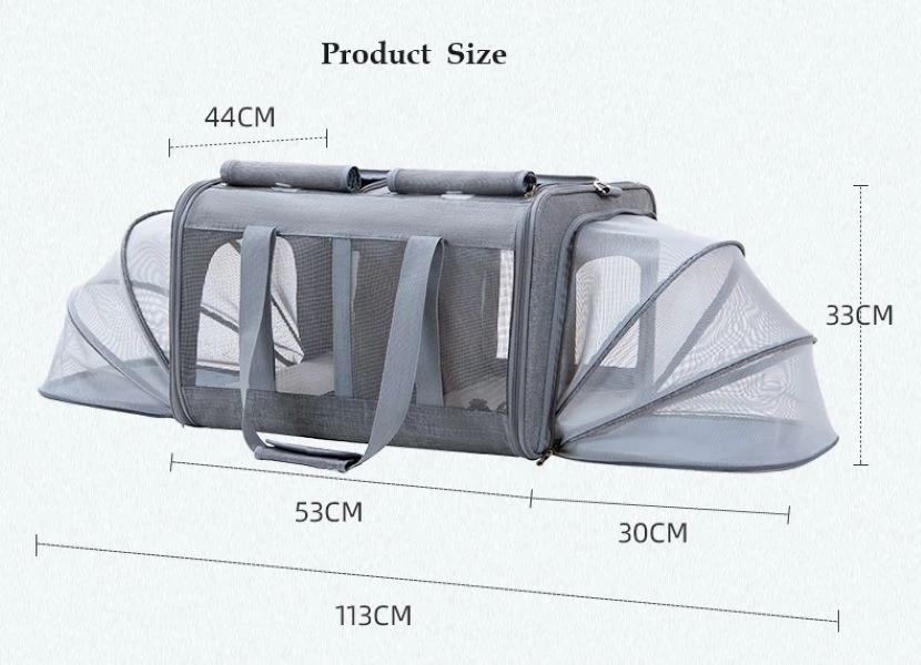Our ingenious double pet carrier is so versatile that it meets all your pet travel needs. Lightweight but durable fabrics, strong stitching, heavy duty zippers and clasps ensures durability and confident handling. Our pet carrier gives you the option of carrying 2 small pets at once using the removable partition or 1 medium size pet. High quality mesh windows so your pet has sufficient air flow and high visibility to reduce anxiety. Re-enforced metal pillars and floor boards for structural support. Standard size is 53cm and with both sides extended it opens up to 113cm giving your pet ample space to settle in while placed either on a car seat or floor. Your pet will not feel cramped and will stay relaxed for a longer period of time. Top or side access points for placing or removing pet from the carrier. Collar safety leash reduces risk of pets escaping when opening the carrier. Comfort mats that are removable for easier cleaning. Shoulder strap option to free up hands. Collapsible to save storage space when not in use. What's in the box 1 x Double Pet Carrier 1 x Shoulder Strap |