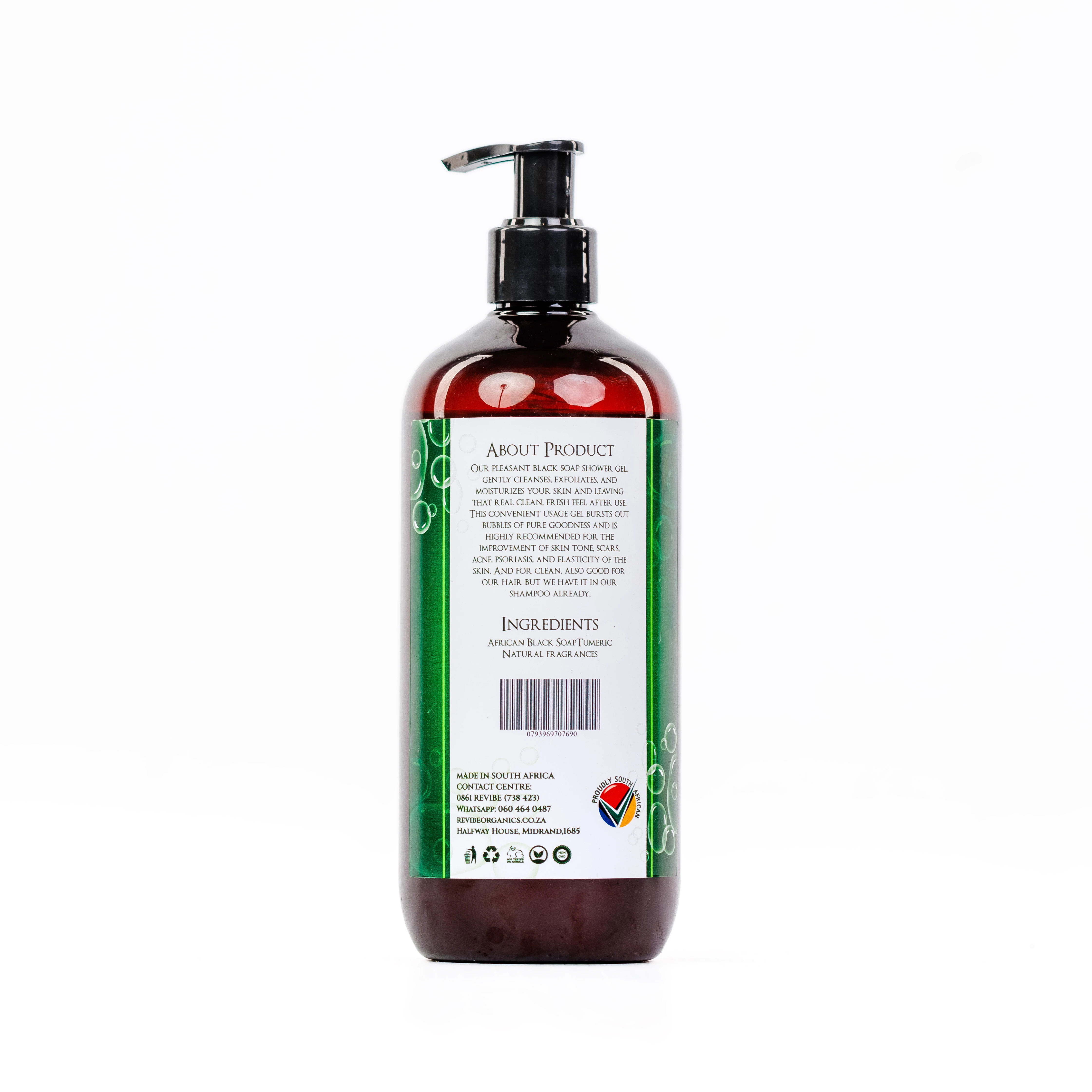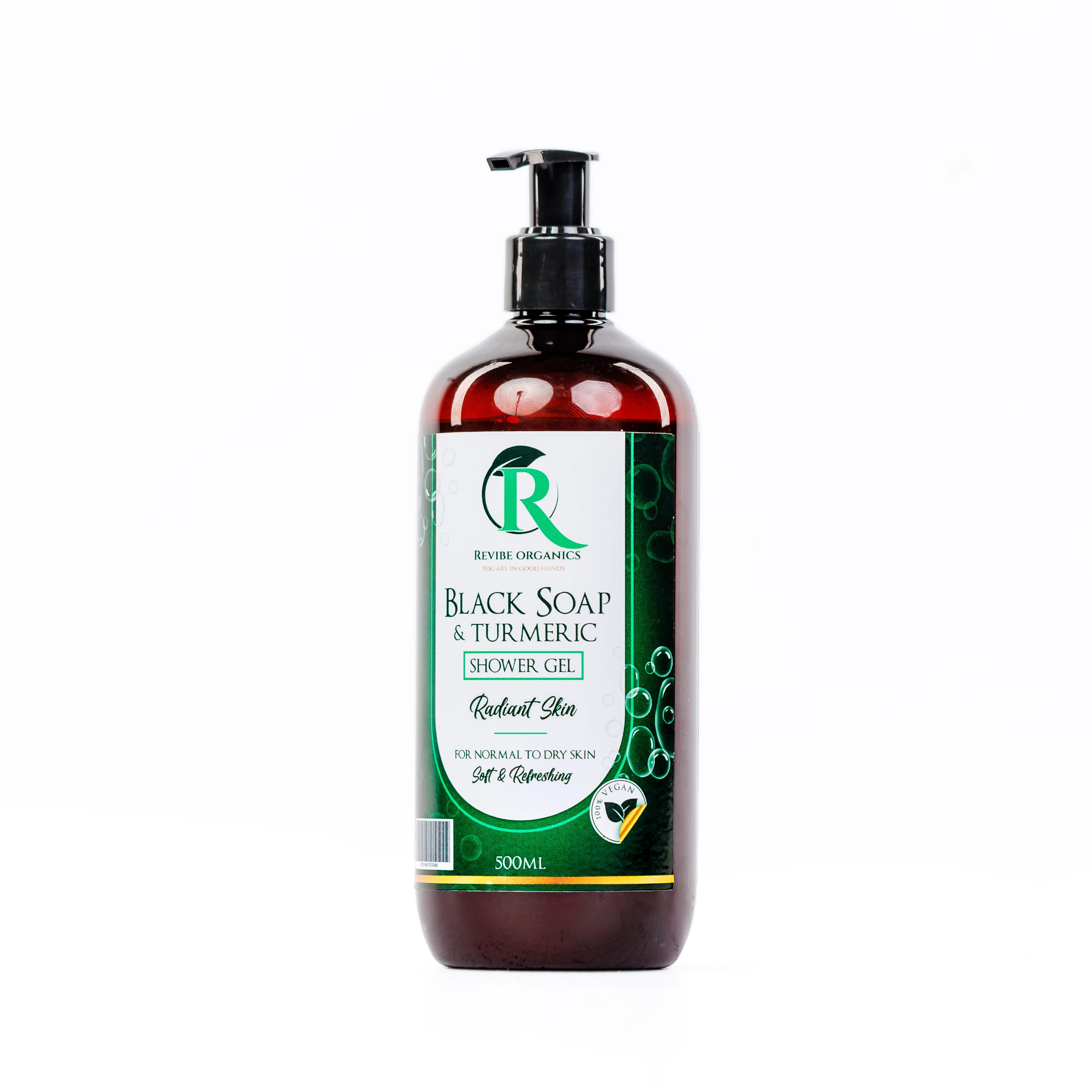 Black Soap & Turmeric Glow Shower Gel Side: 500ML Cleanse. Brighten. Rejuvenate. Revibe Organics Black Soap & Turmeric Glow Shower Gel is a nourishing botanical blend that gently cleanses, exfoliates, and hydrates the skin, leaving it fresh, smooth, and radiant after every wash. Infused with the healing power of African Black Soap and the brightening properties of organic turmeric, this skin-loving formula helps improve uneven tone, fade blemishes and acne, and support overall skin elasticity. Naturally antibacterial and non-drying, it's suitable for daily use, even for kids and sensitive skin types. How to Use Our Black Soap & Turmeric Glow Shower Gel