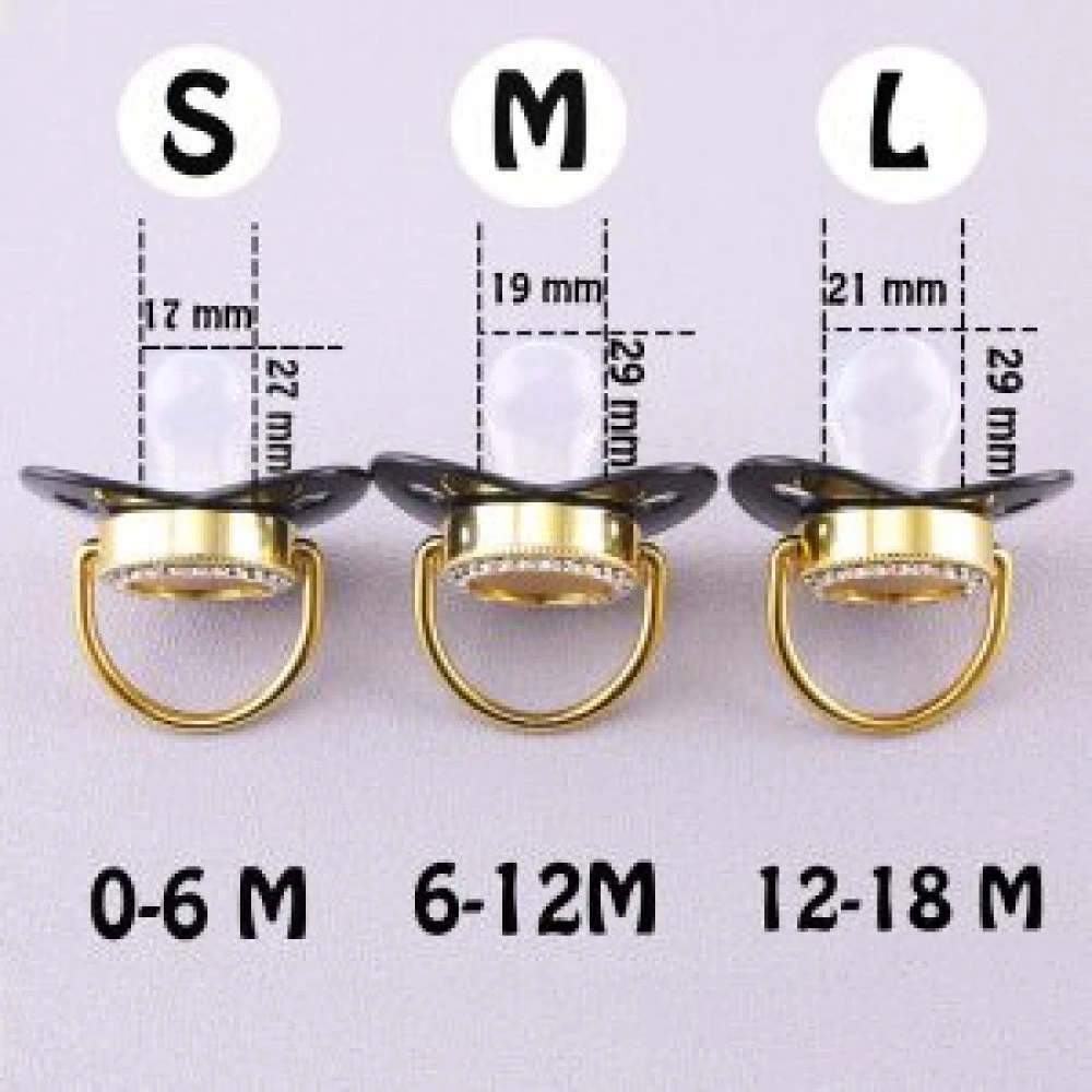 Designer inspired pacifier with matching clip available. Care: Wipe, Do not boil or place in dishwasher. Please view image for sizes. |