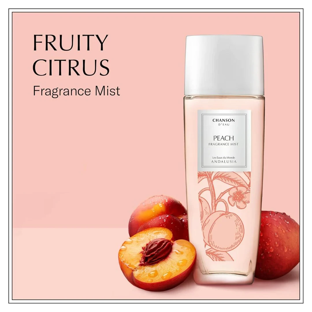 Embark on a journey to the sun-drenched landscapes of Andalusia with Les Eaux Du Monde Peach fragrance mist. This citrusy and fruity fragrance for women opens with zesty bergamot, enhanced by velvety sweet peach and a deep musk base. Light and uplifting, Chanson d'Eau's Les Eaux Du Monde fragrances are designed to be worn all over the body and hair. Try layering with other fragrances in the collection to create your own unique, signature blend. Each Chanson d'Eau Les Eaux Du Monde Mist fragrance mist is presented in a classic, gently curved glass bottle featuring an elegant illustration of the signature ingredient. Begin your sensorial journey and be inspired by idyllic locations around the world. A refreshing world of fragrances for women is here, with Chanson d'Eau Les Eaux du Monde. FRAGRANCE NOTES: