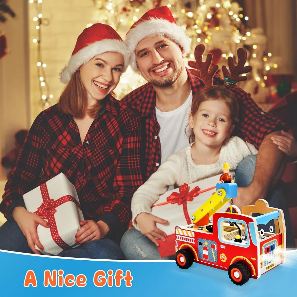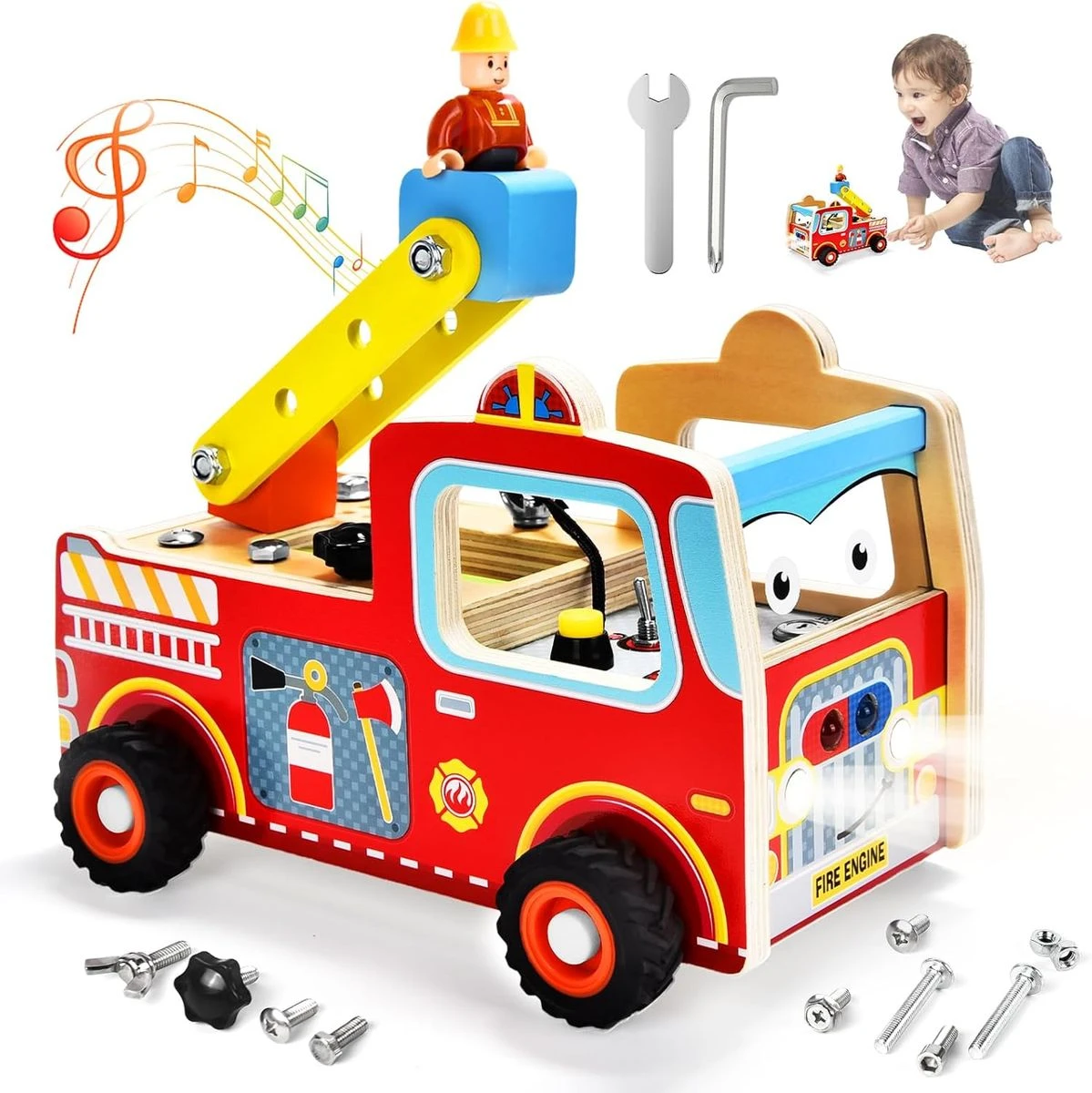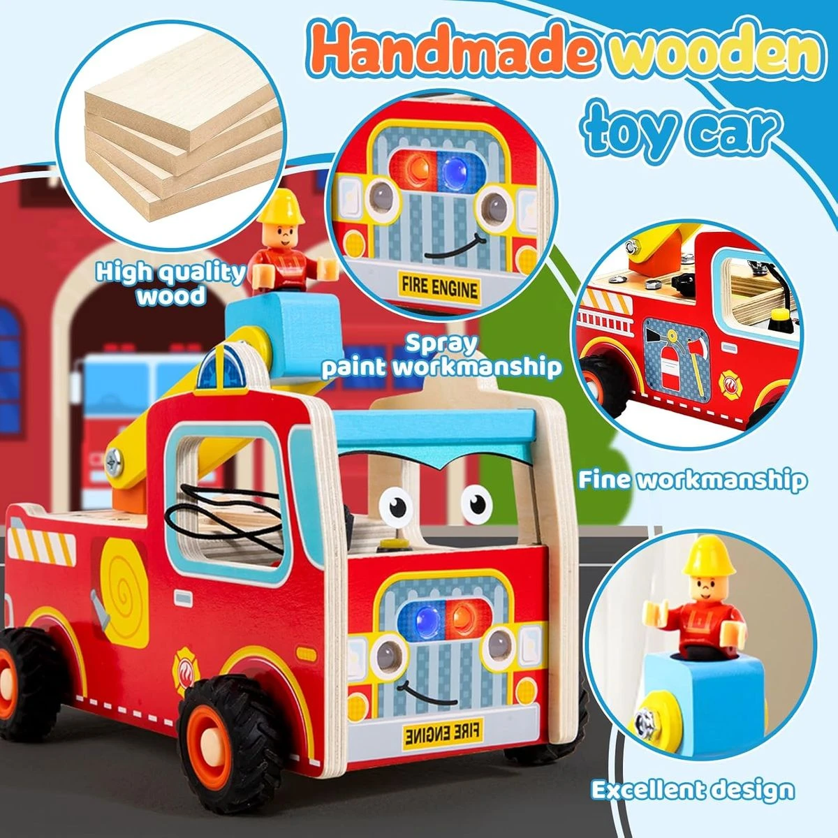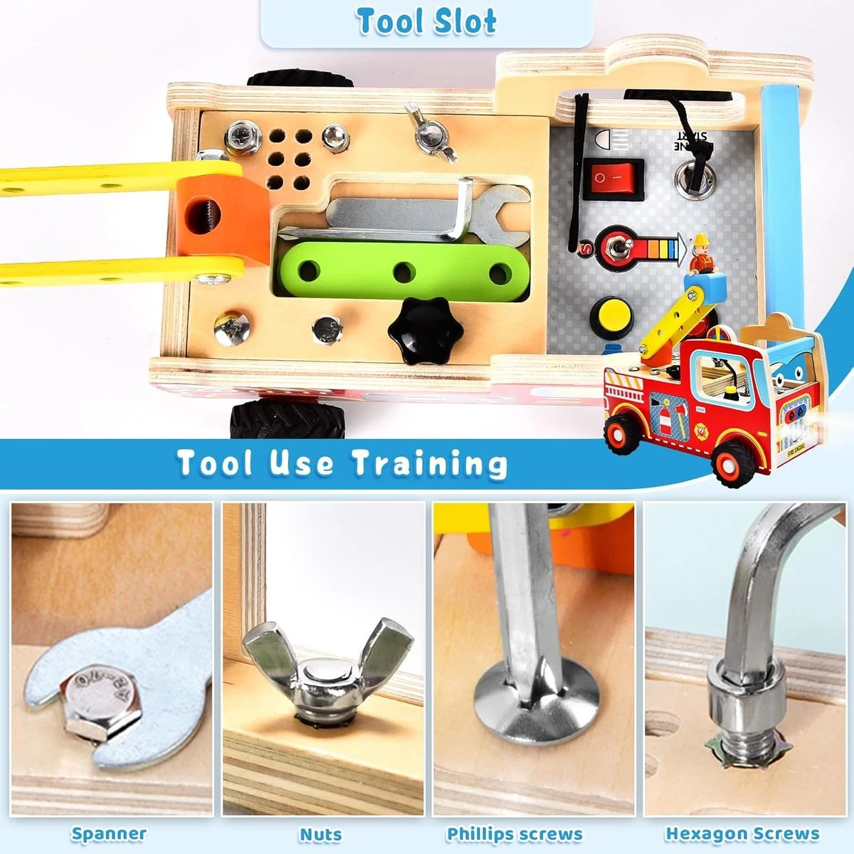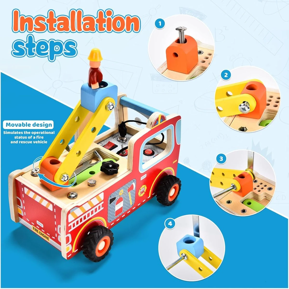 Our fire engine combines three exciting elements in one: a wooden busy board, toddler activity center, and fine motor skills toy. It's the ultimate toy for young adventurers, offering endless opportunities for imaginative play and skill development. Children's favorite, the fire engine shape adds an extra element of excitement to playtime. With its vibrant colors and authentic detailing, it captures the imagination and inspires endless firefighting adventures. Crafted from high-quality wood, it boasts electronic light-up switches and realistic sound effects, providing a multisensory experience that children will adore. The busy board feature introduces children to the thrill of driving with its combination of headlights, sirens, horn, lights, and sound effects. It provides a realistic driving experience that helps children immerse themselves in the joy of operating a vehicle. Additionally, the fire engine features a 360-degree rotating ladder that can be manually adjusted, enhancing the fun and excitement of the toy. The inclusion of screws and a screwdriver tool allows children to practice and refine their fine motor skills as they assemble and disassemble parts of the fire engine. It's a hands-on activity that fosters coordination, concentration, and problem-solving skills. Through interactive play, children also learn to recognize and use various tools, including wrenches, Phillips screwdrivers, hex screws, and nuts. Our toys are designed to stimulate children's curiosity and creativity. It makes a great gift for boys and girls ages 3 4 5 and 6 and gently introduces early learning concepts while encouraging independent exploration and discovery. Let your child experience the excitement of simulating a fire rescue mission and exploring the world of tools with our versatile fire truck toy. What's in the box 1 x Fire engine truck toy 1 x Watch toy 1 x Puzzle |