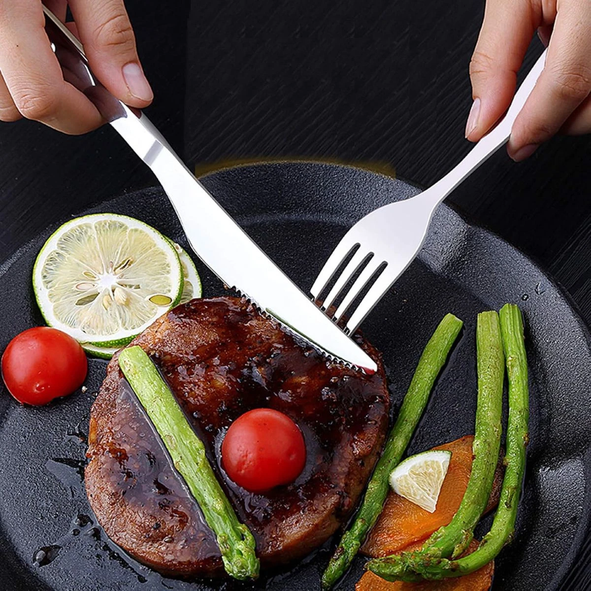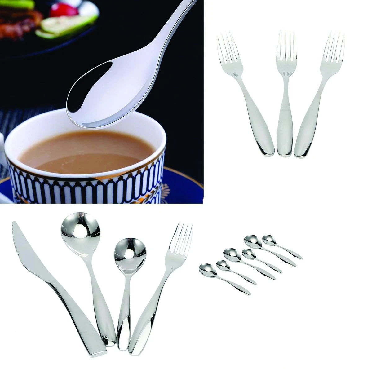 The Series Stainless Steel Cutlery Set comes with 24 pieces, including 6 dinner spoons, 6 forks, 6 butter knives and 6 tea spoons, providing everything you need for a complete dining experience. Crafted from high-quality stainless steel, this cutlery set is designed to ensure your health and withstand everyday use. Its rust-resistant and durable construction guarantees years of reliable performance. With a clean and classy look, this cutlery set features a smooth surface and mirror polish that keeps it shining, elevating your everyday meals into a fine dining experience. The modern flatware design complements any table setting. The cutlery set is easy to clean and maintain, as it is dishwasher safe. The polished mirror finish also makes it rust-resistant, ensuring its enduring appeal for long-lasting use. Whether for daily family meals or special occasions, this multi-purpose cutlery set is perfect for various dining needs. Perfect for most glasses and jugs, also used as ice cream spoon, ice teaspoon, coffee machine spoon, cocktail mixing spoon. And stylish design with ergonomic feel, superior mirror finished surface, smooth edge definitely no big stain. Suitable for bar, home, party use. Bearding essential hot. Easy to use and clean; suitable for family parties, picnics, trips and office use, also a great gift choice for your families. The tableware is made of high quality stainless steel, which is durable and rustproof. What's in the box 6 x Spoons 6 x Fork 6 x Teaspoon 6 x Steak knives |
