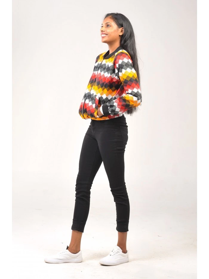 This Diamane Afriprint Bomber is a Java print; the wax is used as a laminated coating over the cotton fibers to give it that nice glossy feel Guaranteed Real African print 100% cotton / 117 gr/m² Fabrics come in a standard size of 6yards (5.5mtrs) |