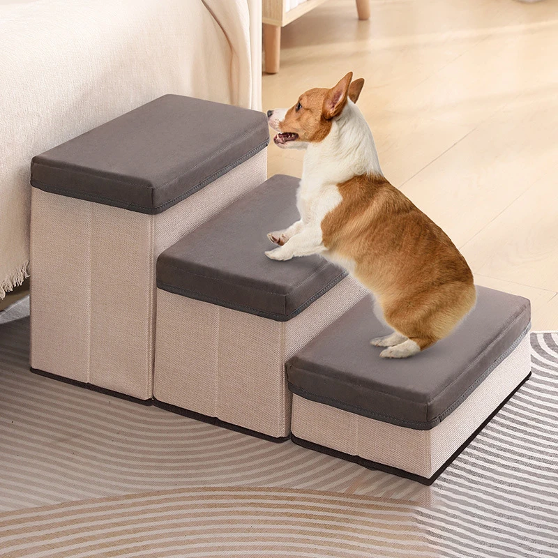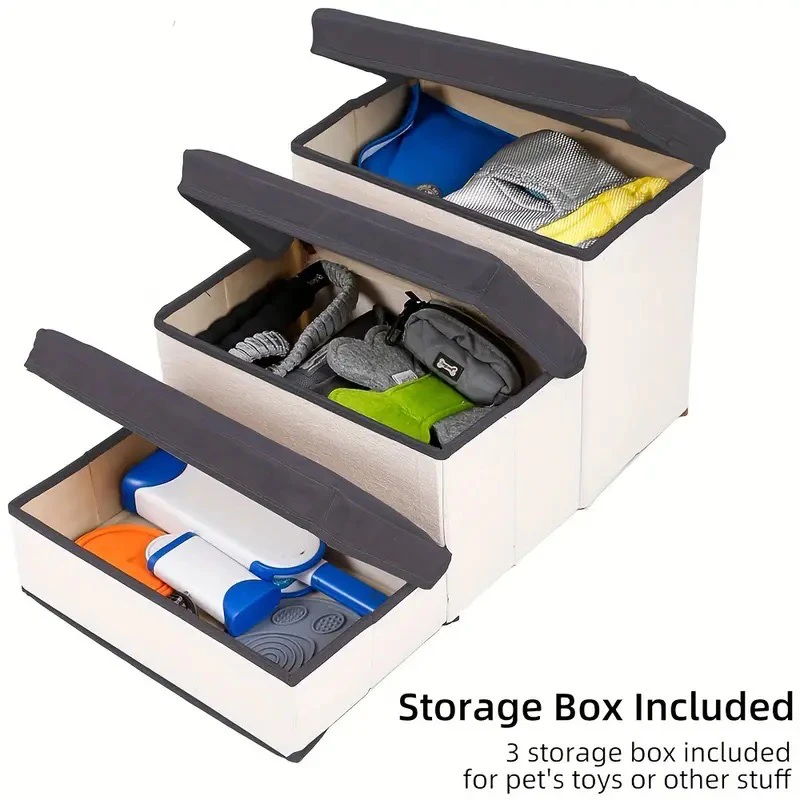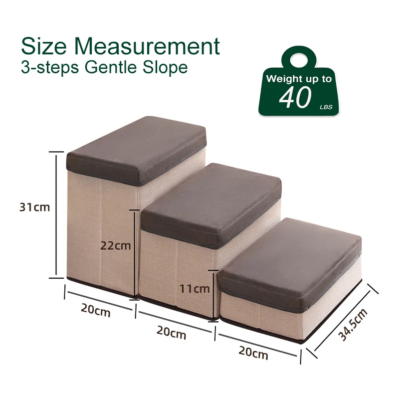 Size: 60 x 34.5 x 31 cm Easy assembly & Portable - You can assemble the dog steps in 10 seconds. Lightweight and sturdy, this pet staircase can be easily moved, moved and stored for convenient access. The pet steps fold flat so you can easily store them under your sofa or bed. Adjustable - Why use 3 steps when you only need 2? With zipper, you can separate the stairs to adjust the height. The overall size of the three-tier style is 75 x 33 x 44 cm. Convenient Storage Function - This foldable pet step stool is not only a ramp, but also a storage box for dog or cat items. With 3 large capacity storage spaces under the dog and cat step stool, you can put dog clothes, blankets, nursing tools or other pet accessories to find them easily. Hold up to 40 LBS - Sturdy construction holds up to 40 lbs, so it can easily accommodate even large dogs. The steps are 20cm wide to provide a stable seat. They are ideal for small to medium dogs and large puppies, making it easy for elderly, arthritic or small pets to reach high beds, chairs, sofas, cars or other hard to reach spaces. What's in the box 1 x Dog Stairs |