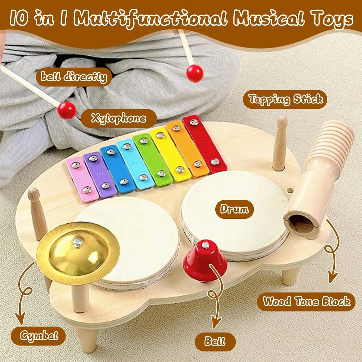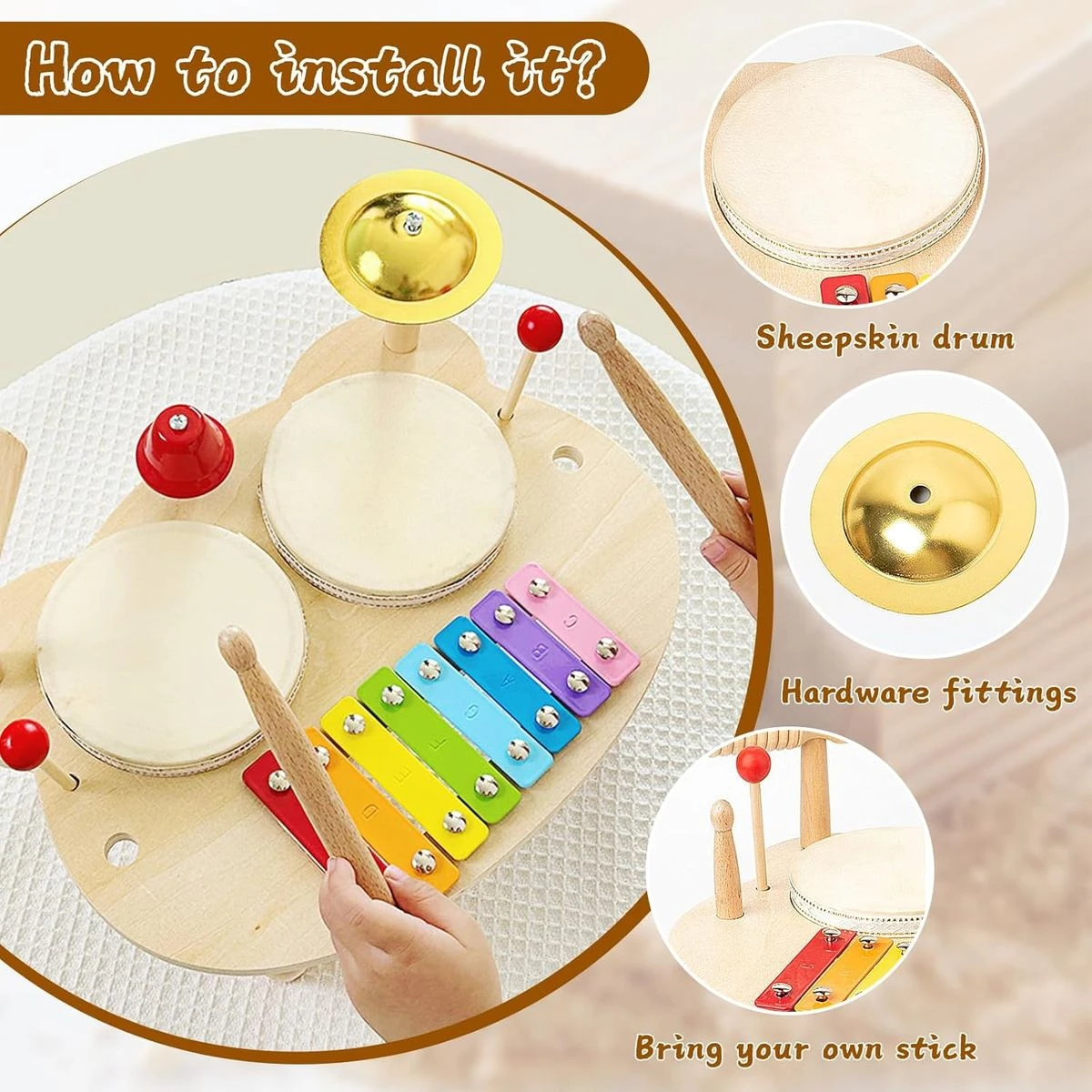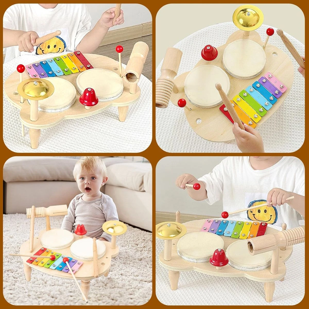 Our children's musical instrument set combines a variety of percussion instruments that can play different melodies. promotes your toddler's musical interest. Contains 1xxylophone music table, 1xwooden tone block, 4xwooden sticks. 2x drums, 1x cymbal, 1x bell, read and use it after assembly. This drum set is a perfect educational musical toy for boys and girls musicians, make them happy by playing the drum and playing on the xylophone to inspire the child's talent in music, with various instruments that can tap. Various Things Melodies are played, from gentle breezes to majestic valleys and lively bird sounds, giving your child an extensive musical experience. The children's drum kit is made of wood material, which has a hard texture, is not afraid of being damaged and more durable to play with, with a smooth surface and rounded edges. It does not cut your hands, does not clamp your hands in the corners and protects the safety of the baby. The baby instrument set comes with a slot in which you can store the hammer, so you do not lose the accessories quickly. All instruments are removable and come with 4 sturdy legs and a box for easy transport and storage. Children can play melodies or rhythms at their own pace, improving their hand-eye coordination. Parents can communicate with their children to make music, help children express themselves through music and promote communication and interaction with parents. This baby xylophone game is a great toy that boys and girls aged 3 4 5 6 years old love. Drums for children are a fun and educational gift. This is a surprising musical sensory toy for children, birthdays, parties, holidays and Christmas. What's in the box 1 x Wooden drum toy 1 x Watch toy 1 x Puzzles |