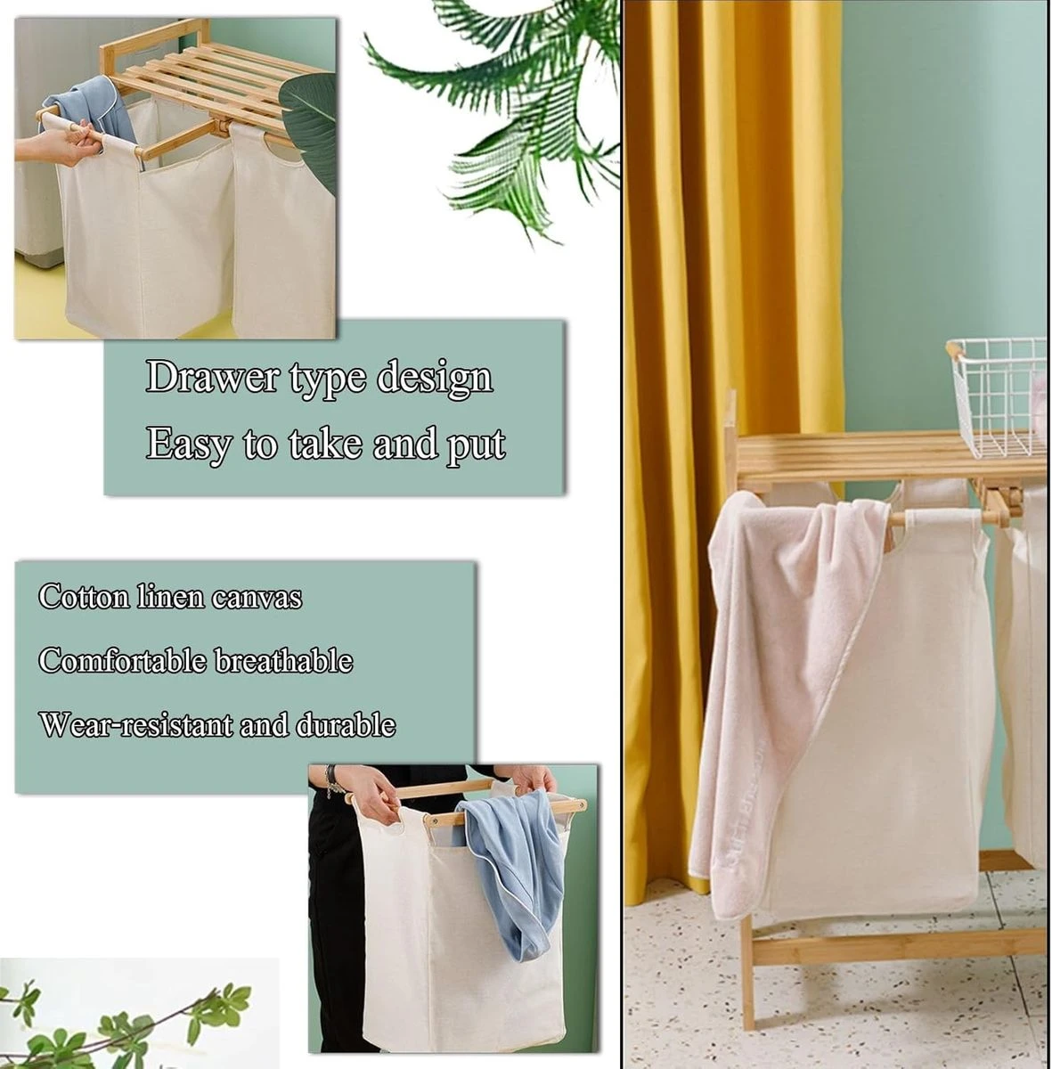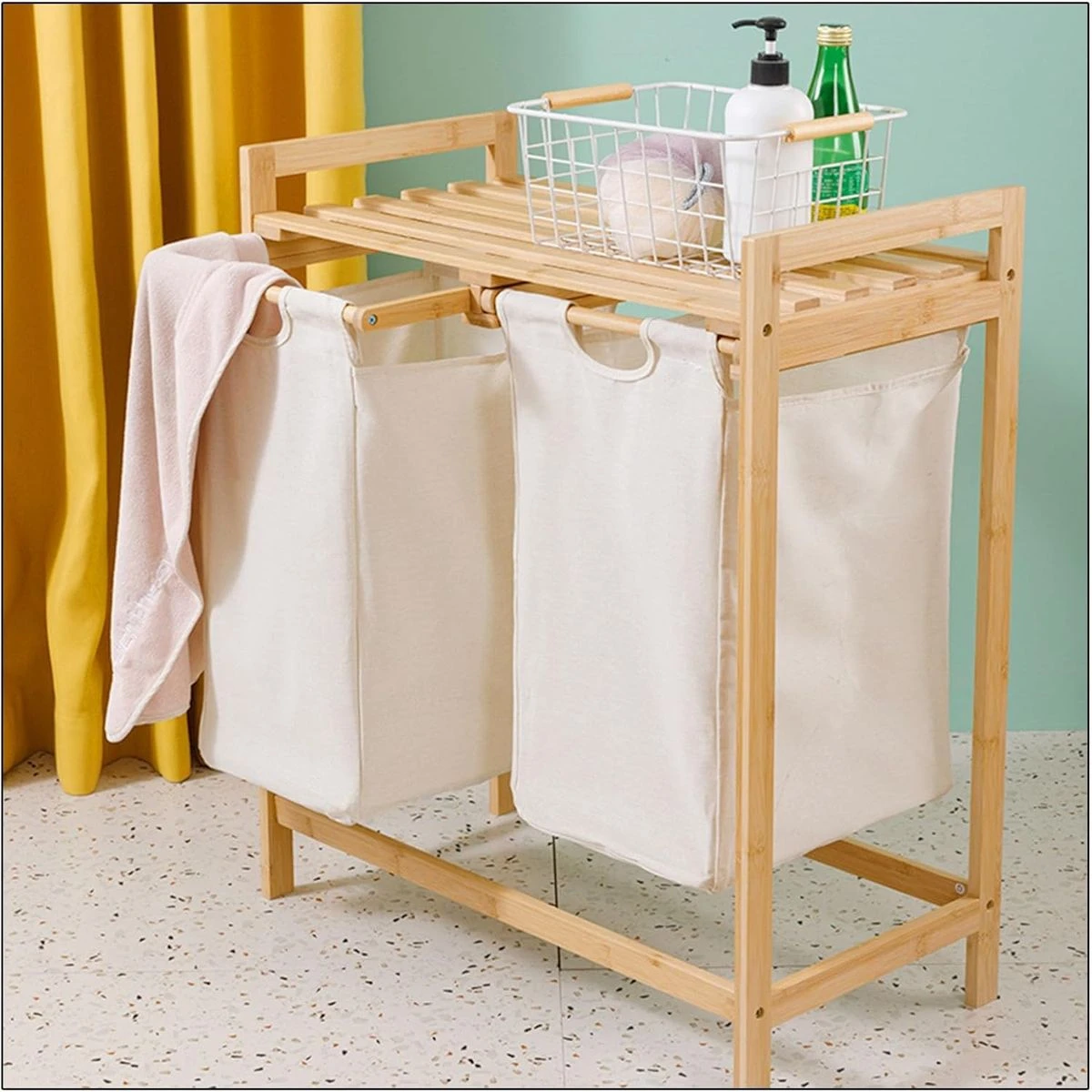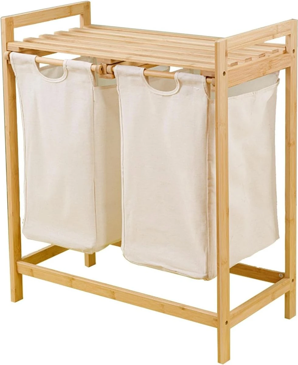 The combination of a laundry basket and storage shelves creates an ideal storage solution. The storage rack is designed to accommodate detergents, clothes, towels, and various bathroom essentials. It is paired with a spacious Oxford laundry basket, providing plenty of storage space for your clothes. The laundry basket rack is meticulously crafted from durable natural bamboo, introducing a touch of nature to your laundry area. The shelves are firmly connected to sturdy legs, ensuring not only substantial load-bearing capacity but also effective resistance to moisture. The laundry basket features a tilted design and easy-to-use handles for effortless use. You can easily slide the basket or transport dirty clothes by folding it slightly. When not in use, lifting the Oxford laundry basket allows for convenient cleaning of the rack. Beyond its role as a fabric laundry basket, this unit doubles as a hamper with lid for storing toys, books, linens, groceries, and more. This dual function maintains cleanliness and organization in your bathroom, bedroom, and living room. Plus, the laundry basket is versatile enough to serve as a shopping hamper for your daily essentials. Laundry baskets may show slight wrinkles upon initial assembly due to folding during shipping. However, these creases will naturally fade over time. Therefore, you can purchase with complete confidence. What's in the box 1 x Bamboo Laundry organizer |