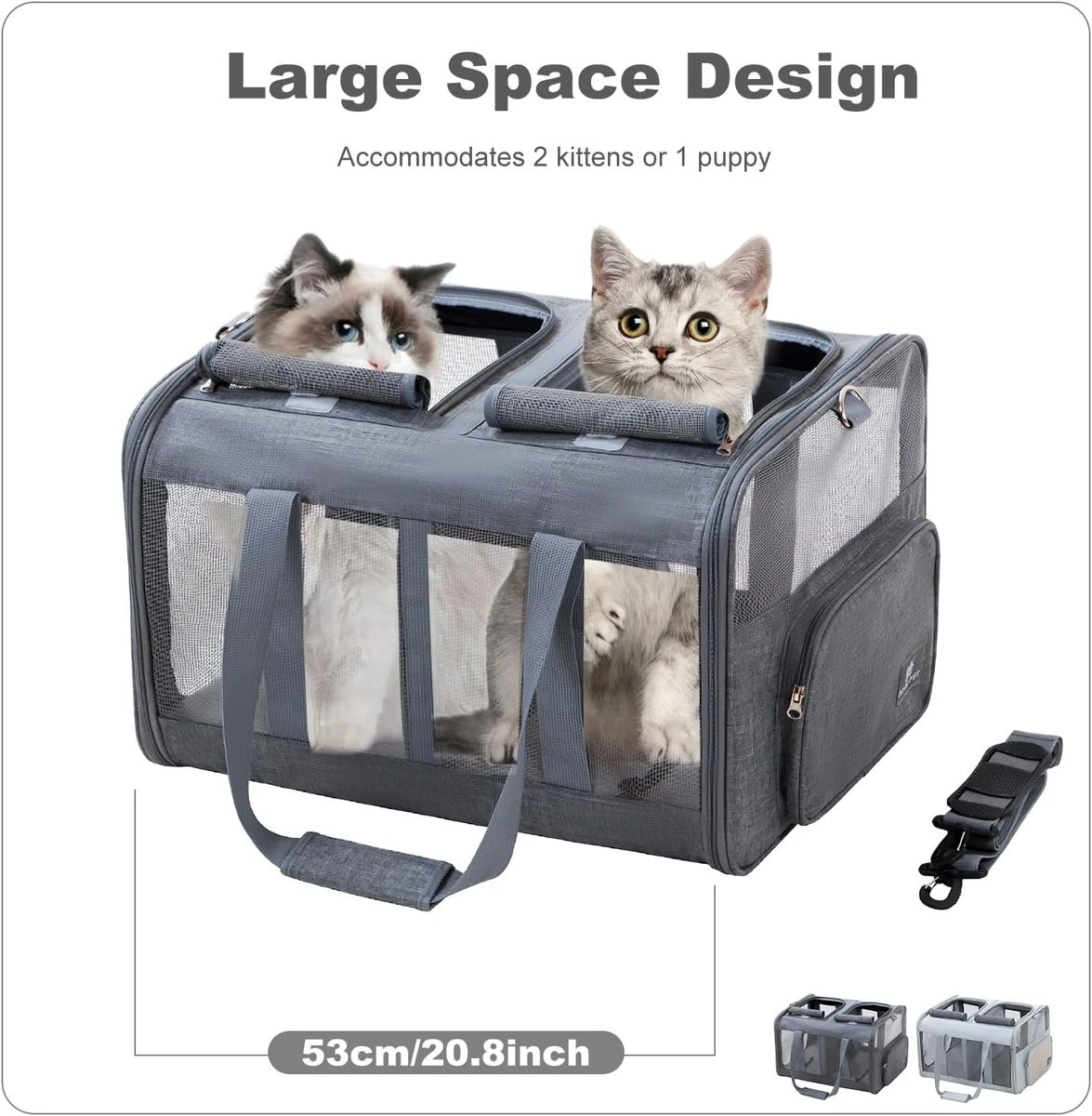 Choose the dog transport bag not only according to the weight. Select the travel bag for your pet first according to the dimensions of the animal and stay within the maximum weight limit to have enough space for your pet. The 5-sided mesh design of this pet bag offers plenty of breathability and visibility in any situation, so that your pet can observe the outside world. With a divider in the middle, the bag is divided into two sections, making it suitable for taking several pets. The roll-up flap over the top mesh opening can help reduce your pet's anxiety. This dog bag is made of high-quality Oxford fabric and mesh fabric, and the bottom is supported by a composite panel that does not allow the bag to collapse. The self-locking zipper and inner safety hooks provide your pet with a spacious space and ensure your pet's safety. This travel bag for dogs can be securely attached to the front car seat with a safety belt and a shoulder strap, so that your pet is kept safe while driving. Side pockets for convenient storage of treats, leash, bags or anything else your pet needs on the go. It comes with an adjustable shoulder strap so you can choose the travel routes. Two compartments divider design, separate zones for space, less crowded and more comfortable for cats and cats What's in the box 1 x Pet Carrier 1 x Grooming Comb 1 x Harness Seatbelt |