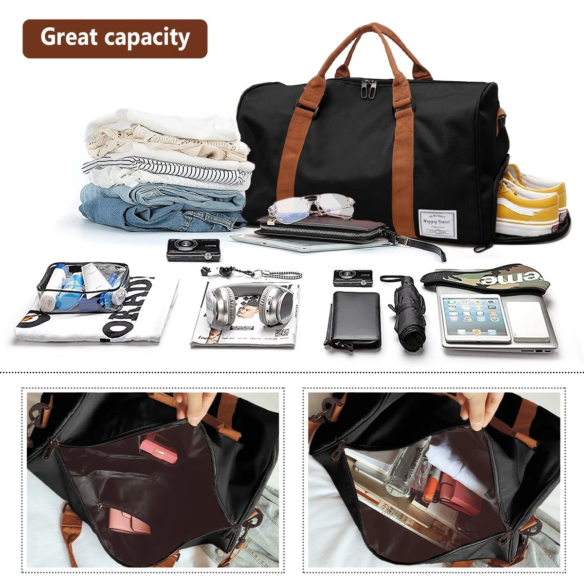 - Suitable For Gym , Swimming, Travel, Business Trips And Other Multi-Scene Fitness Bag, - Wear-Resistant And Water-Resistant - High-Density Oxford Fabric, With Wear-Resistant Waterproof Features For Your Travel Escort. - Large Storage Space - It Is Enough For Short Trips, And Can Easily Accommodate 3-5 Days Of Travel Clothing To Meet Travel Needs. - Lightweight Design Of Bag - Comfortable, Breathable And Sweat Absorbent - The Shoulder Straps Are Structured In A Comfortable Way, Breathable And Absorb Sweat. Wide Straps Reduce Shoulder Pressure. The Ergonomic Back Pad Makes - You Feel Comfortable Even Under Heavy Load For A Long Time. - Multi-Functional Carrying - Bag A Variety Of Ways To Carry, Single Shoulder/Crossbody/Portable, According To Demand To Switch, With Various Occasions - Side Independent Shoe Bin Design, Shoes And Clothes Can Be Sorted And Stored, Clean And Hygienic Its Polyester Outer Cover Will Keep Your Notebooks And Computer Dry In The Rainy Season. Specifications: -Color: Black - Material: Polyester - Measures: 48cm X26cm X 40cm - Weight: 300g - Waterproof: Yes - Number Of Compartments: 5 What's in the box 1 x Gym Duffle Bag |