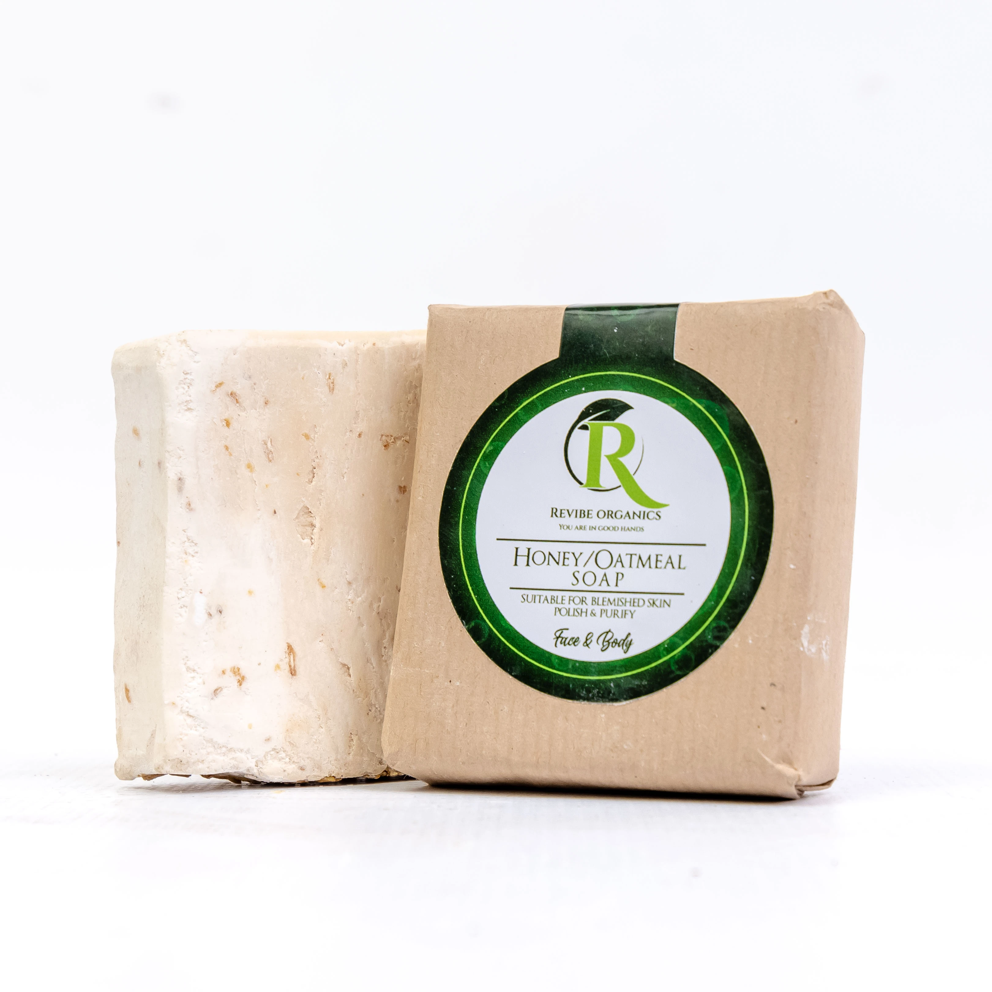 Honey & Oatmeal Soap Size: 100G Soothe. Exfoliate. Glow Naturally. Revibe Organics Honey & Oatmeal Soap is a gentle, nourishing bar crafted with nature’s finest ingredients. Rich in antioxidants, antibacterial properties, and natural exfoliants, this soap revitalizes the skin while preserving its natural moisture balance. Honey soothes and protects the skin, while oatmeal gently exfoliates, calms irritation, and leaves your skin feeling soft, smooth, and radiant. Perfect for daily use and suitable for all skin types, including sensitive or dry skin. How to Use Our Honey & Oatmeal Soap
