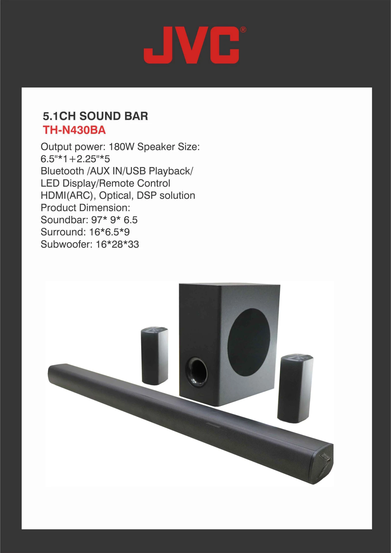 Output power: 180W Bluetooth function FM function LED display USB input HDMI (ARC) input Full remote control 1 Year Warranty JVC 5.1 Channel 180W Sound Bar TH-N430BAEnhance your home entertainment with the JVC TH-N430BA 5.1 Channel Sound Bar, designed to deliver a powerful 180W audio experience with immersive surround sound. Whether you're watching movies, gaming, or listening to music, this system provides rich, high-quality sound with deep bass, all in a sleek and space-saving design. True 5.1 Channel Surround Sound ā Experience a cinematic, multi-directional audio experience that brings every scene to life. Powerful 180W Output ā Delivers crystal-clear highs, detailed mids, and deep bass for a balanced and dynamic sound. Wireless Connectivity ā Easily stream music from your smartphone, tablet, or other Bluetooth-enabled devices. Versatile Connectivity Options ā Includes HDMI ARC, Optical, AUX, and USB inputs for seamless compatibility with TVs, gaming consoles, and more. Built-in Subwoofer for Enhanced Bass ā Enjoy deeper, more impactful bass without the need for additional speakers. Slim, Space-Saving Design ā Fits neatly under your TV or can be wall-mounted to complement any modern setup. User-Friendly Controls ā Comes with a remote control for effortless sound adjustments and mode selection. The JVC TH-N430BA 5.1 Channel Sound Bar is the ultimate home theater upgrade, offering a cinematic and immersive audio experience while maintaining a stylish and compact design. |
