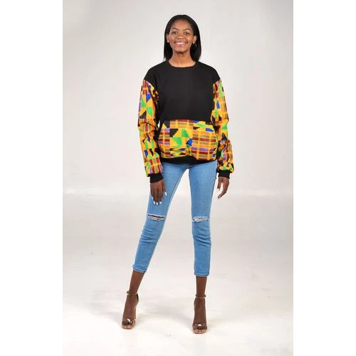 This KKente Pocket Sweater is a Java print; the wax is used as a laminated coating over the cotton fibers to give it that nice glossy feel Guaranteed Real African print 100% cotton / 117 gr/m² |