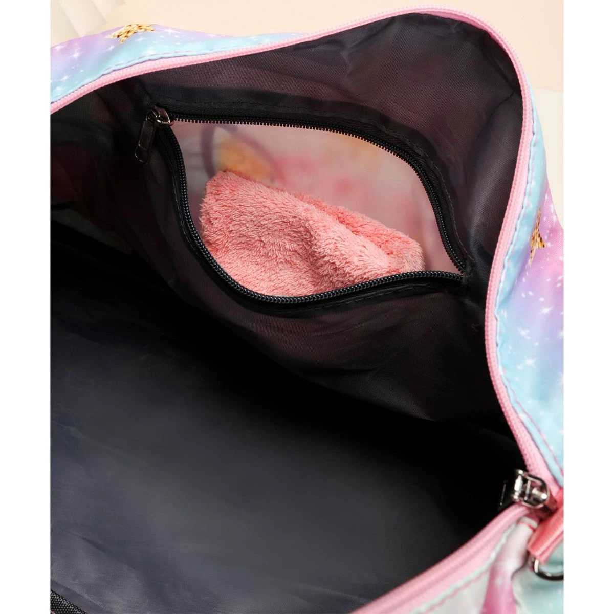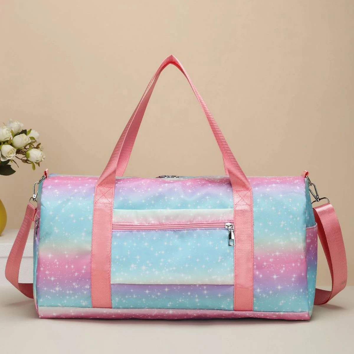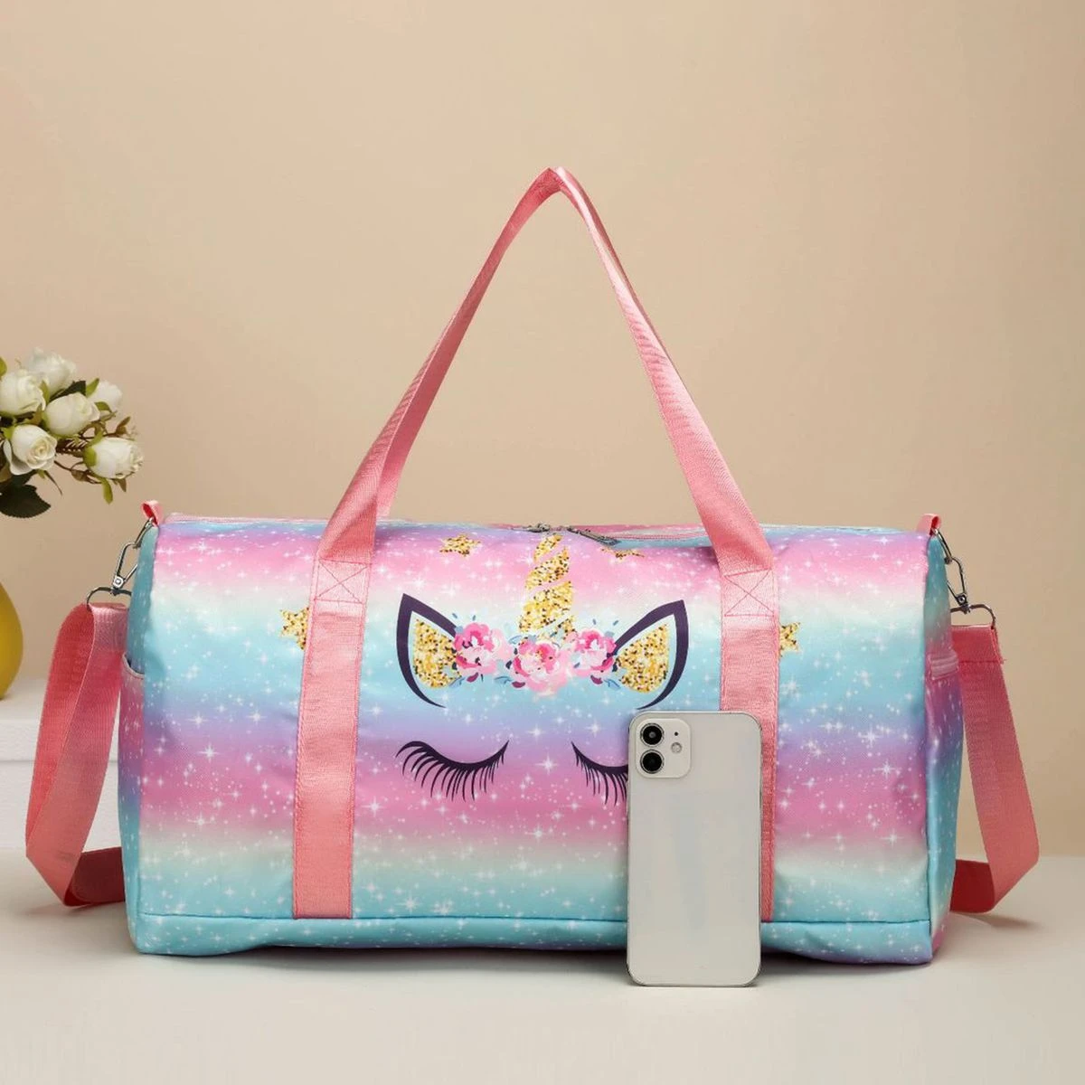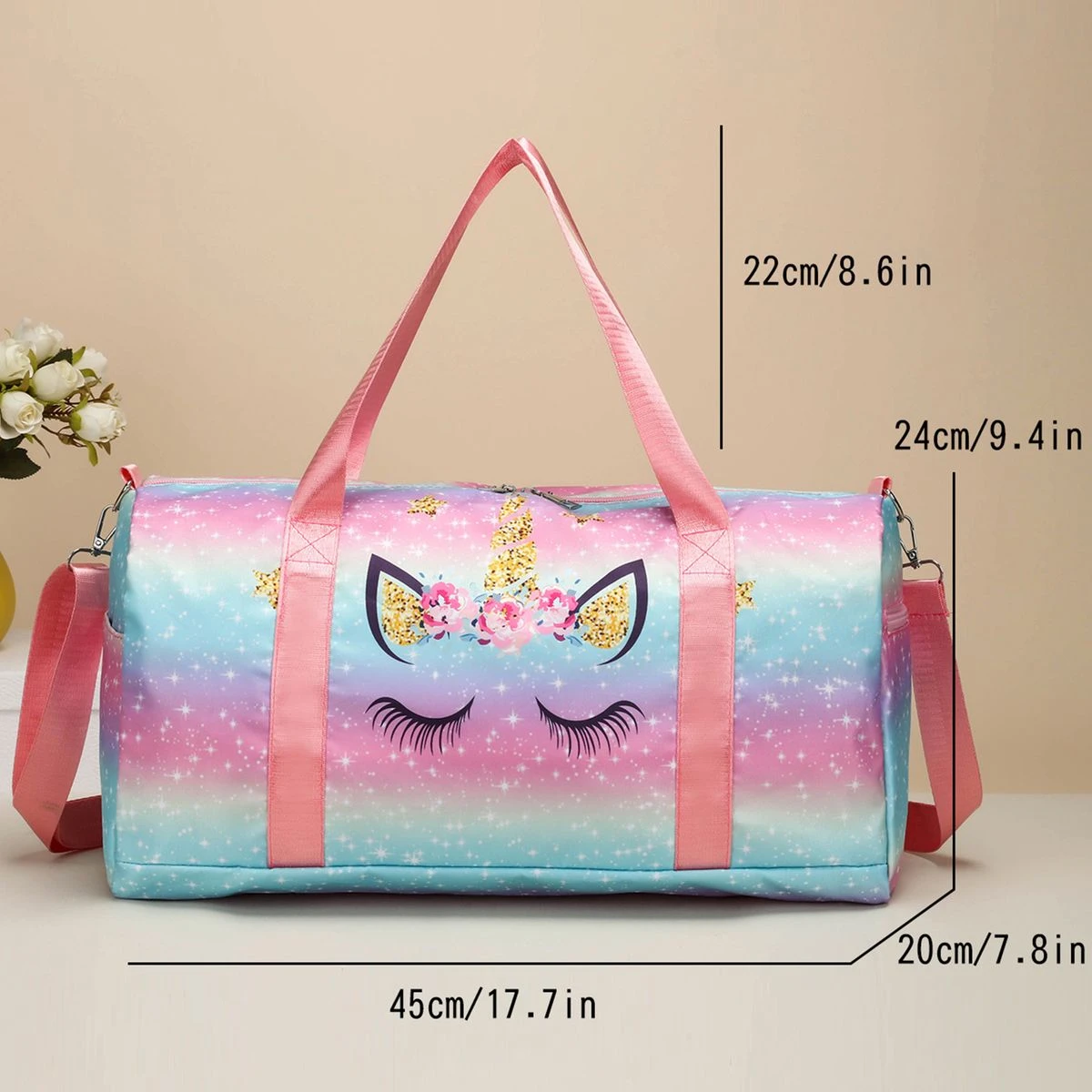 Features The girls duffle bag with cute rainbow unicorn printed design makes the girls fall in love with it quickly, the fabric is safe and water resistant(This will protect your inner items from drizzle, while not in heavy rain.) perfect birthday/Christmas New Year gift for girls. This girls gym bag delivers spacious storage with 1 large main zippered compartment for dry & clean clothes or everything for gym & traveling you necessary, and 1 large waterproof PVC pocket with zipper for wet items. Separate compartment to store your sneakers, dance shoes and shoes, swimsuits, toiletries, and wet towels. Additional storage pockets to organize your items and gym accessories. 1 main compartment with 1 inner zipper pocket, 2 interior open pockets, 1 large wet compartment, 1 side water bottle pocket. Different sizes pockets are enough for you to hold your items like 14" or under laptop, iPad, A4 files, books, umbrella, sunglasses, cosmetics and other daily things, keeping them well organized. Dance bag for girls, teens dimensions 18.1L x 8.5W x 9.4H inches (46x21x24cm), the perfect carry-on compliant bag for airline travel. Integrated trolley sleeve slides over rolling luggage handle making airport travel a breeze. Your ideal overnight weekend boarding. The bag can be used both indoor and outdoor. Girls duffel bag with handles, and removable shoulder strap with adjustable buckle. Your good companion for sports, could be served as a gymnastics bag, sports gym bag, dance bag, cheerleading bag, camp / airplane duffel, carry-on luggage. Specification Material: Oxford, Polyester Colour: Multicolor Weight: 300g Capacity: 20-35L Dimensions (LWH), handle height included: 45 x 20 x 46 cm What's in the box 1 x Duffle Bag |
