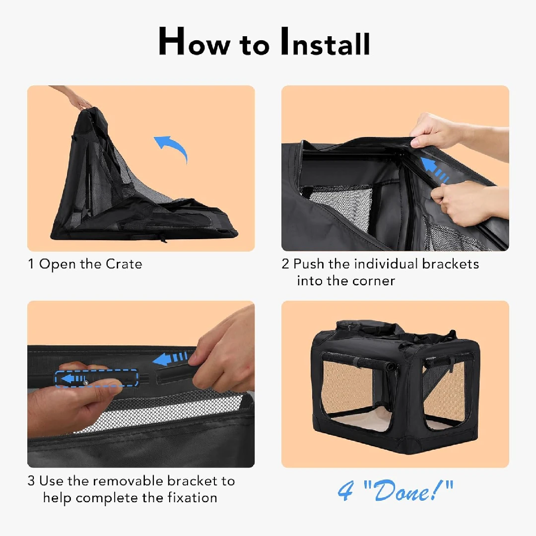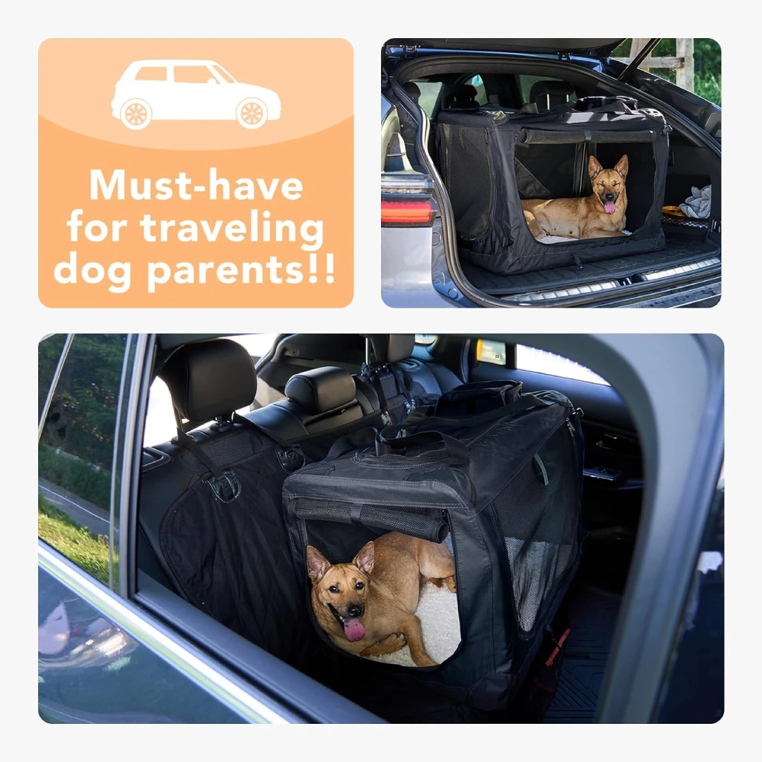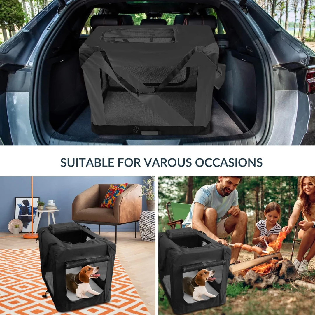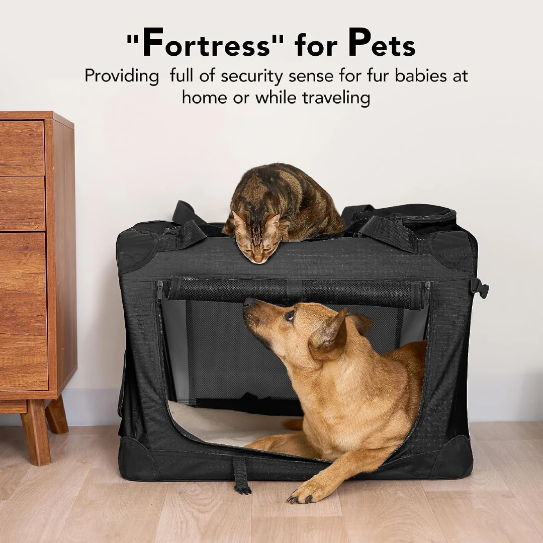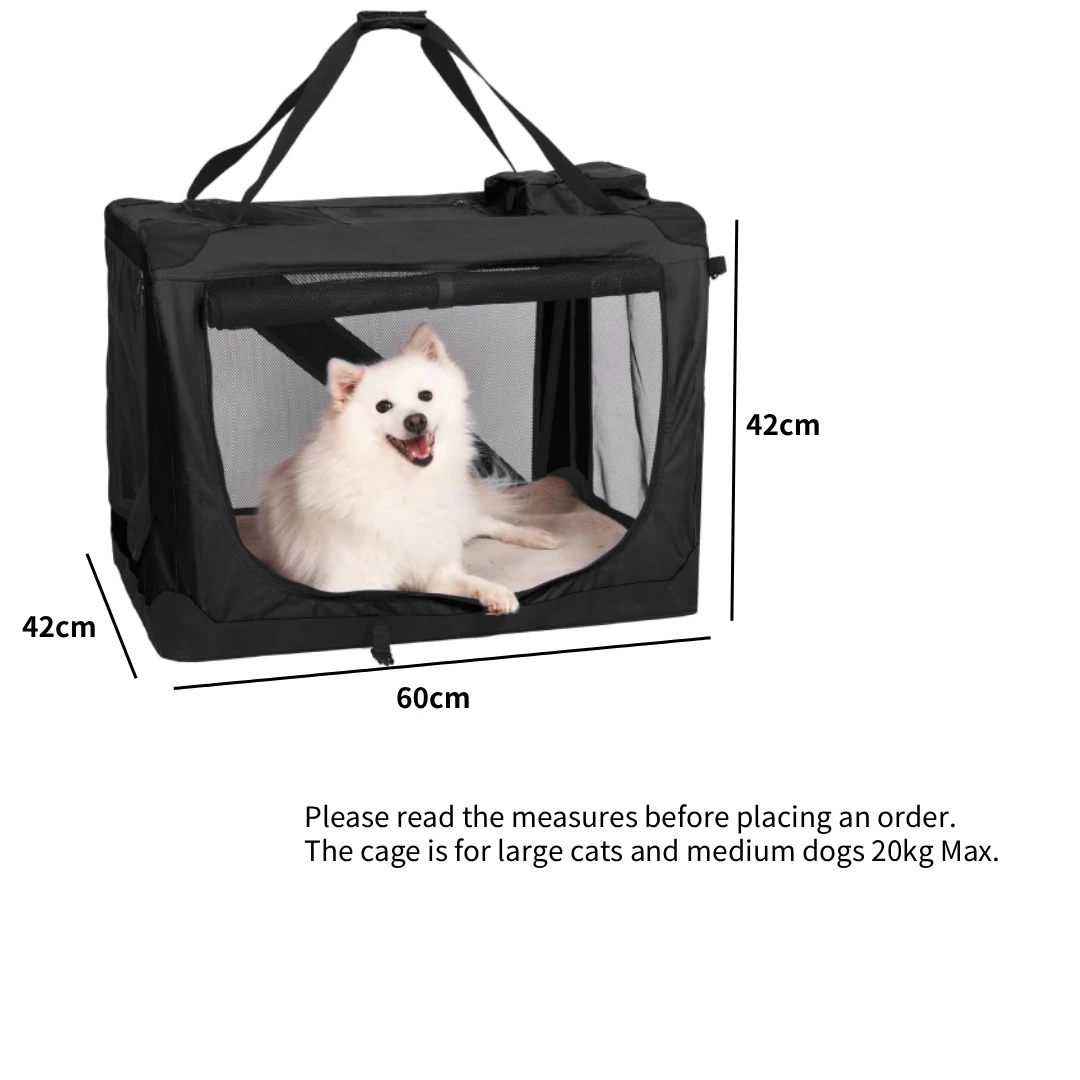 Tips: The pet carrier is large, please read the measures before placing an order as the product is for large cats and medium dogs 20kg max. Indoor Outdoor Use: Whether as a travel dog crate for a car trip with your pet or as a pet bed at home, our soft sided dog crate could provide a safe, cozy dwelling for your pets. Recommended to roll up our dog collapsible crate's mesh doors, as a pet bed at home train for a while, and let pets get used to it before traveling. Product Dimensions: 60x42x42cm. Ideal for medium dogs and large cats. Recommended for crate-trained dogs or other pets. Measuring your pet before choosing the carrier Easy to Use: Sets up in seconds with no tools needed. And our dog crate comes with buckles to help store it compactly. Made of high-toughness 600D Oxford fabric and a sturdy steel frame, durable to use. Convenient for Travel: 3 mesh doors (on the top, front, and side) convent for sunlight and breathability. And your furry friends can enjoy the view and fresh air from the top mesh door on the car trip helps solve anxiety. An additional bag allows you to place things conveniently. Easy to Clean & Portable. Just 42cm when folded, and come with carrying straps. After our portable dog kennel is washed, could be put into the yard to air dry directly. The accompanying soft mat is removable and washable. What's in the box 1 x Dog Cat Carrier 1 x Blanket |