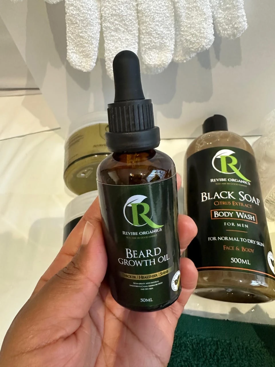 Revibe Organics Men’s Beard Oil Size: 50ml Price: R295 Description: Tame, nourish, and strengthen your beard with our Men’s Beard Oil, a lightweight yet deeply conditioning blend of premium plant-based oils. Specially crafted to keep facial hair soft, manageable, and healthy, this formula also works to moisturize the skin beneath, reducing dryness, itchiness, and flakiness. Infused with botanical extracts and essential oils, it promotes beard growth while leaving a subtle, refreshing finish. How to Use: Dispense a few drops into your palm and rub between hands. Massage evenly through beard and into the skin beneath. Use daily after cleansing or as needed to maintain softness and shine. Ingredients: Jojoba Oil – Balances natural oils and softens hair Argan Oil – Rich in vitamin E to condition and add shine Rosemary Oil – Stimulates growth and supports scalp health Castor Oil – Promotes thickness and strength Sweet Almond Oil – Deeply moisturizes and smooths Tea Tree Oil – Naturally clarifies and reduces irritation Hemp Seed Oil – Nourishes with essential fatty acids Flax Seed Oil – Strengthens strands and prevents breakage |
