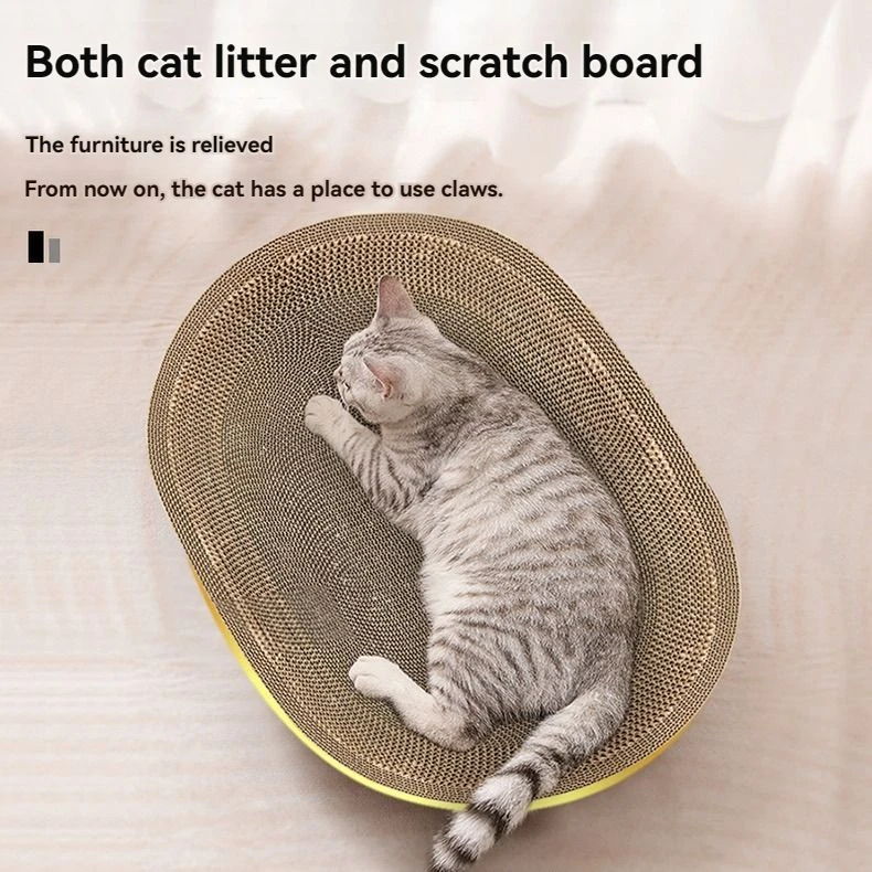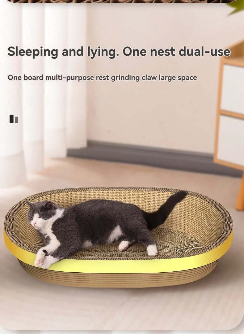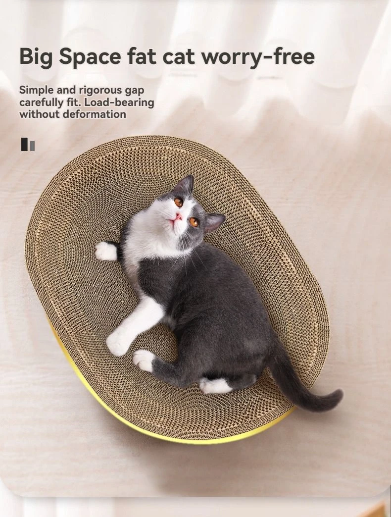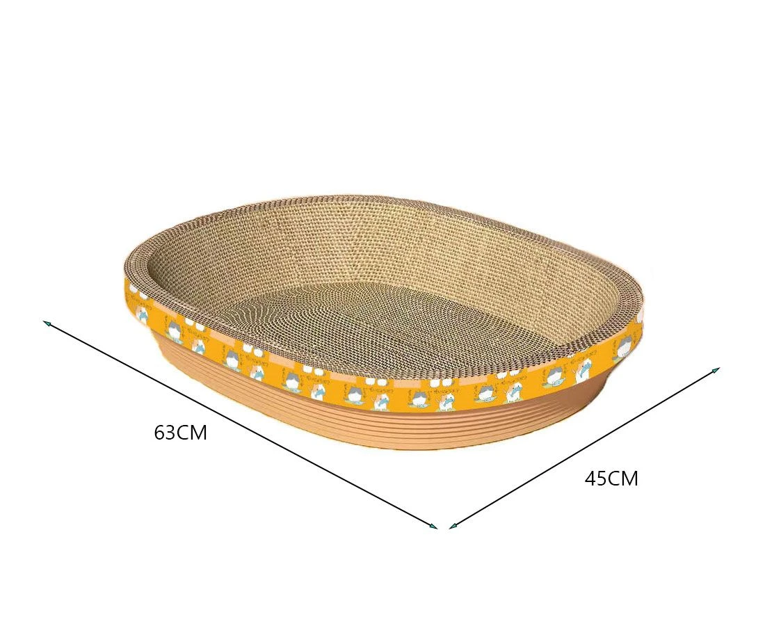 Durable and Sturdy This cat scratching board is crafted from thick and dense corrugated paper that can resist the pressure of an adult without bending or breaking, offering a stable and comfortable bed for your cat to nap and scratch. Water-resistant and Sturdy This cat scratching board is crafted from high-quality cardboard material that can last for a long time and prevent water damage. Prevent Cat Injuries The oval-shaped cat scratching board has smooth corners and fits the cat's cervical spine, so your cat can enjoy scratching without hurting itself. It's also sturdy and long-lasting, allowing your cat to have fun and release its natural urges. Stable and Durable Scratching Board With a reinforced chassis, this scratching board won't overturn easily, so your cat can play and sleep with confidence. It also provides a convenient surface for your cat to sharpen its claws and keep them healthy. Wide Applications This cat scratching board can fulfill the various needs of cats, whether they want to scratch, play or rest. It can also serve dog and other pets. Its slim design can help you save space in your home. What's in the box 1 x Scratching Board Bed |