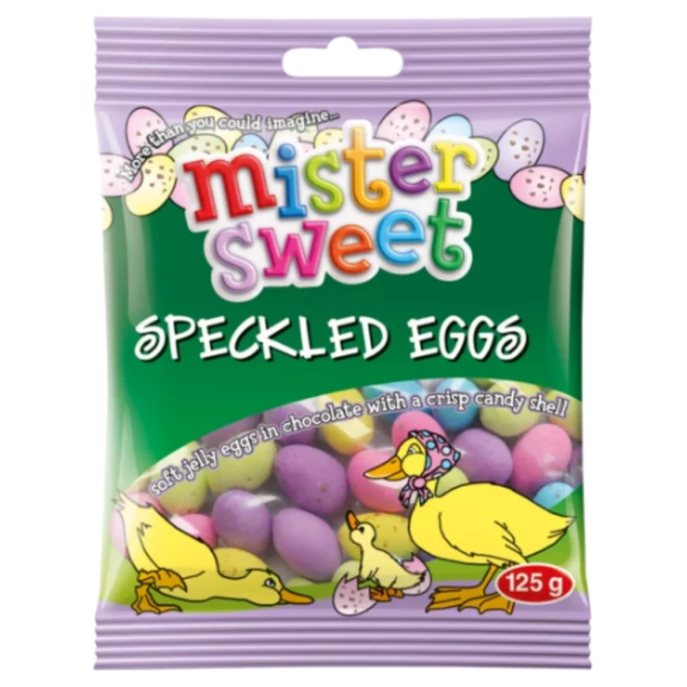Soft jelly eggs in chocolate with a crisp candy shell. What's in the box 24 x Mister Sweet Speckled Eggs 125g |
