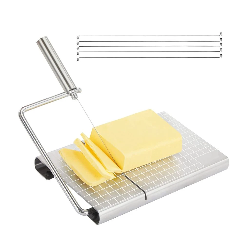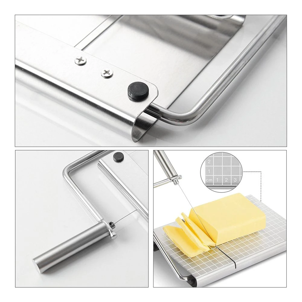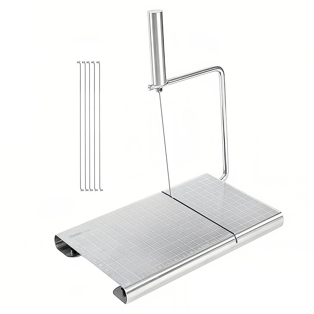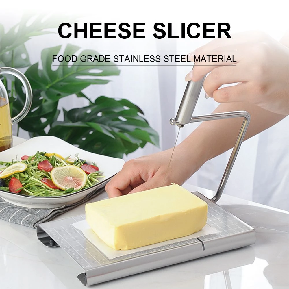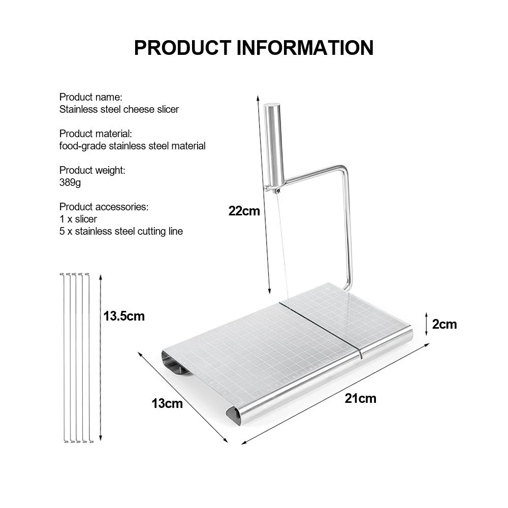 This Cheese Slicer comes with 5 additional replacement wires, providing you with the convenience of easy wire replacement in case of damage. With this cheese slicer, you can enjoy a prolonged usage time. The cheese cutting wire is durable and does not require sharpening, unlike traditional cheese knives. This makes the Cheese Slicer a reliable and sturdy kitchen tool. It is designed with precise and clear grid scale lines, making it easy to cut larger cheese blocks into desired sizes. The upgraded ergonomic design and sturdy craftsmanship provide a comfortable grip while using the Cheese Slicer. It is an essential tool for cheese lovers who want to slice cheese smoothly and evenly. The marked grid helps achieve accurate slice sizes, whether you want thin slices or cubes. You can effortlessly achieve the perfect thickness for your cheese slices, making it an ideal kitchen gadget and a great gift for cheese enthusiasts. Made with food-grade stainless steel material, this Cheese slicer is easy to use and suitable for cutting various types of cheese, including Swiss, Parmesan, mozzarella, and butter, as well as handmade soap. You can even slice vegetables too. With non-slip rubber feet at the bottom to minimize unnecessary movement and sliding, more durable and reliable. This Cheese slicer cutter is easy to clean, so you can just simply throw it in the dishwasher after using. Durable Stainless steel Cheese slicer also for easy cleaning Cheese board with slicer. And it is easy to use, just pull the wire into the corresponding slot in the handle and tighten it. Specifications: Food grade stainless steel material Weight: 389g Size: 2cmx21cmx13cmx22cm Wire size: 13.5cm What's in the box 1 x Multipurpose Cheese Slicer with 5 Wires |