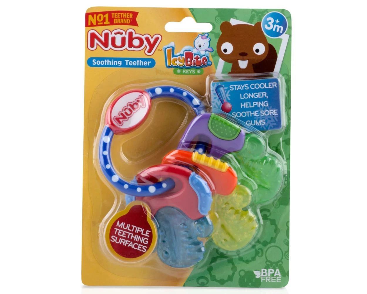 While colourful shapes stimulate your baby visually, the raised, offset surfaces assist in the eruption of new teeth by gently massaging your infant’s gums. This Nuby teether also features areas filled with purICE. The teether can be placed in the refrigerator and the purICE will remain colder longer than water filled teethers. Textured cool surfaces massage, stimulate & soothe sore gums. BPA Free. Suitable for use from 3 months. |