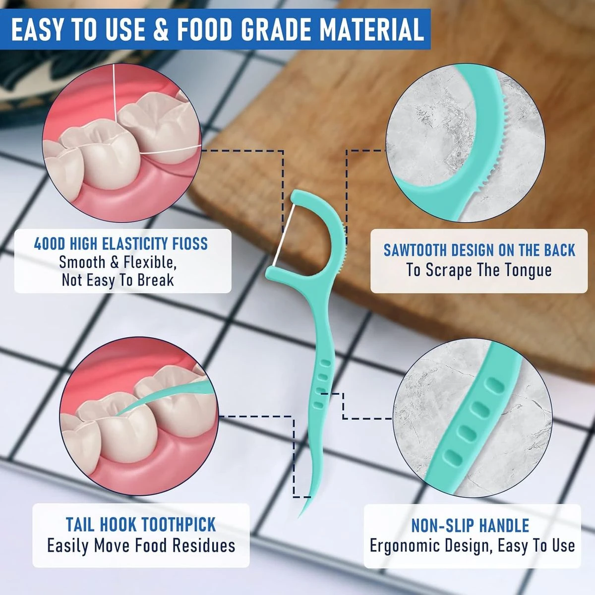 A toothbrush can't clean the gap between your teeth, use a dental floss every day to thoroughly clean the food debris. It has been scientifically proven that using dental floss can effectively improve various dental problems. Such as bad breath, sore gums, gingivitis, plaque, tooth decay, etc. Our dental floss is made of food grade PP material. Highly elastic and soft, it can easily clean your teeth and is not easy to break. The dental floss is thin and suitable for all people, no matter how big or small your teeth are. The high-tension dental floss and ergonomically designed non-slip handle can smoothly slide into the gap between teeth. The tail part is a toothpick that cleans large food debris. At the same time, the back of the dental floss has small grooves to clean the tongue. Our dental floss is mint flavored. It freshens your breath while cleaning your teeth. More efficient than regular floss, especially suitable for important occasions like meetings, parties, appointments and more. Unwaxed and soft dental floss, suitable for everyone's dental cleaning. Large package quantities are suitable for the whole family. What's in the box 1 x Dental floss pick |
