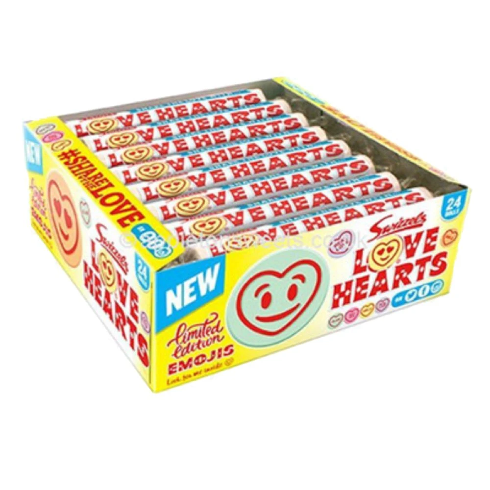 Hard candy in a variety of fruit flavours featuring an emoji face on one side of the sweet. Country of Origin: UK Weight: 39 g Hard candy in a variety of fruit flavours featuring an emoji face on one side of the sweet. What's in the box 10 x love hearts Rolls 39g |