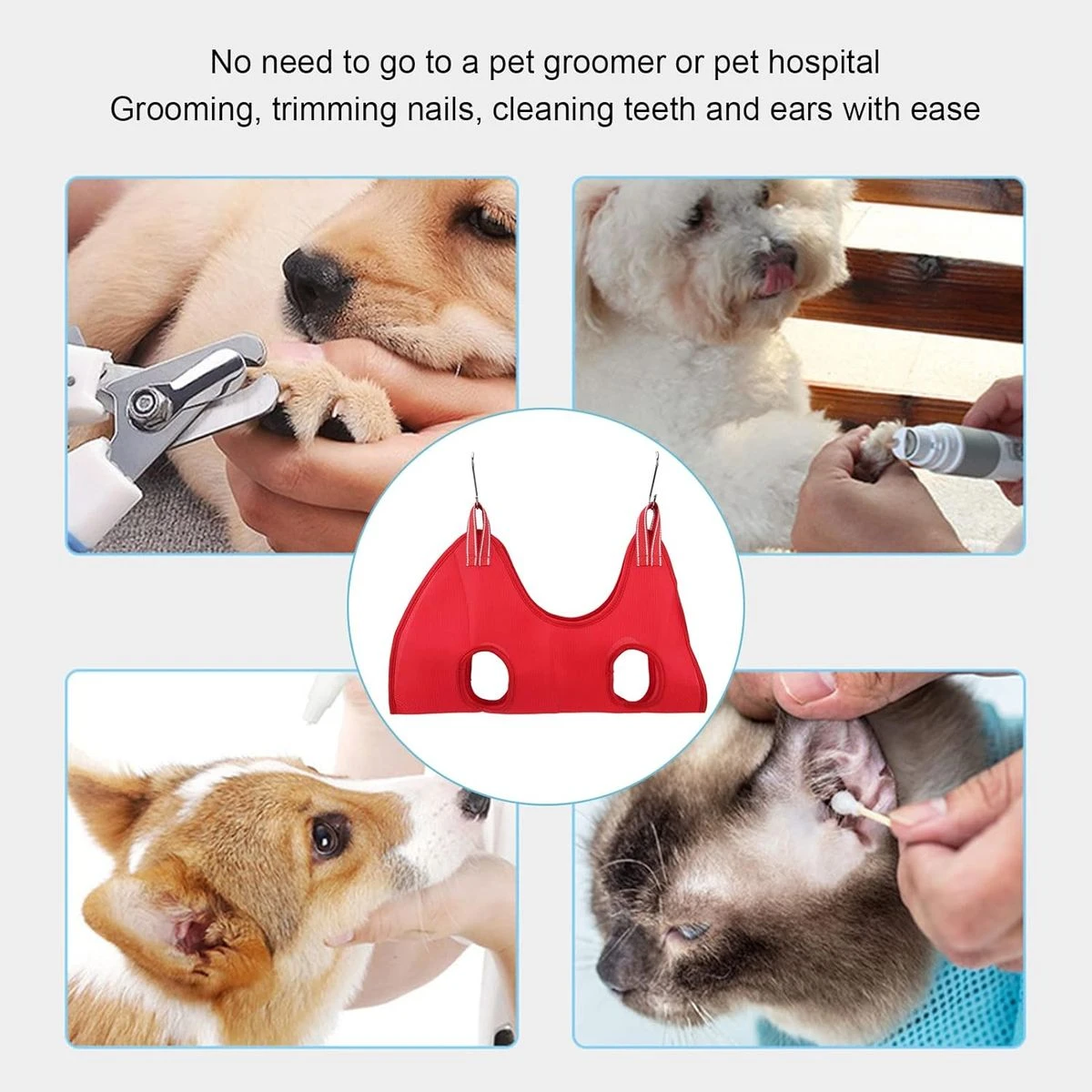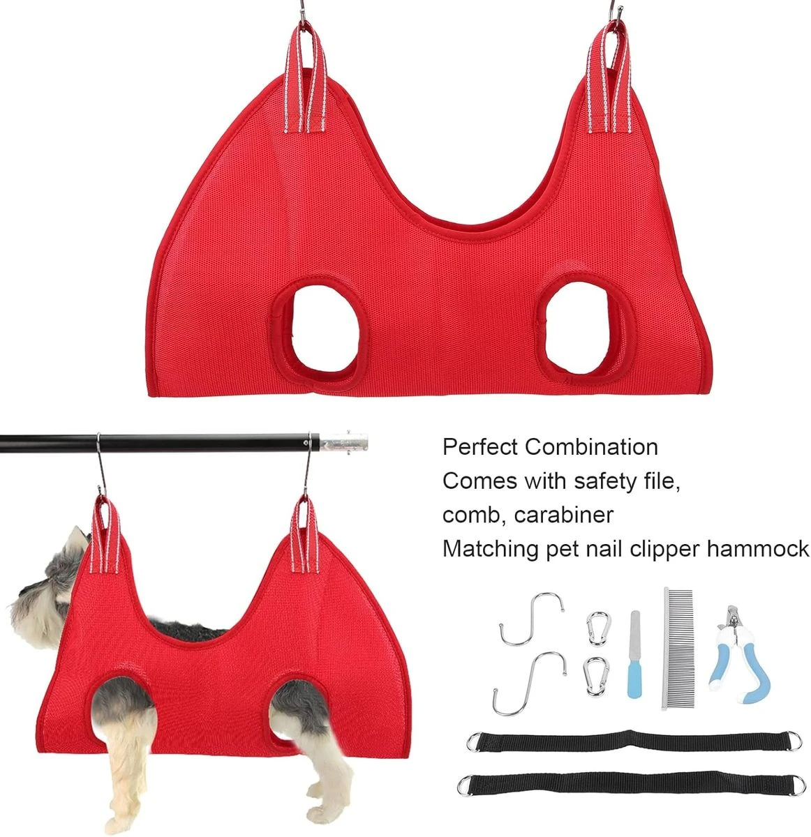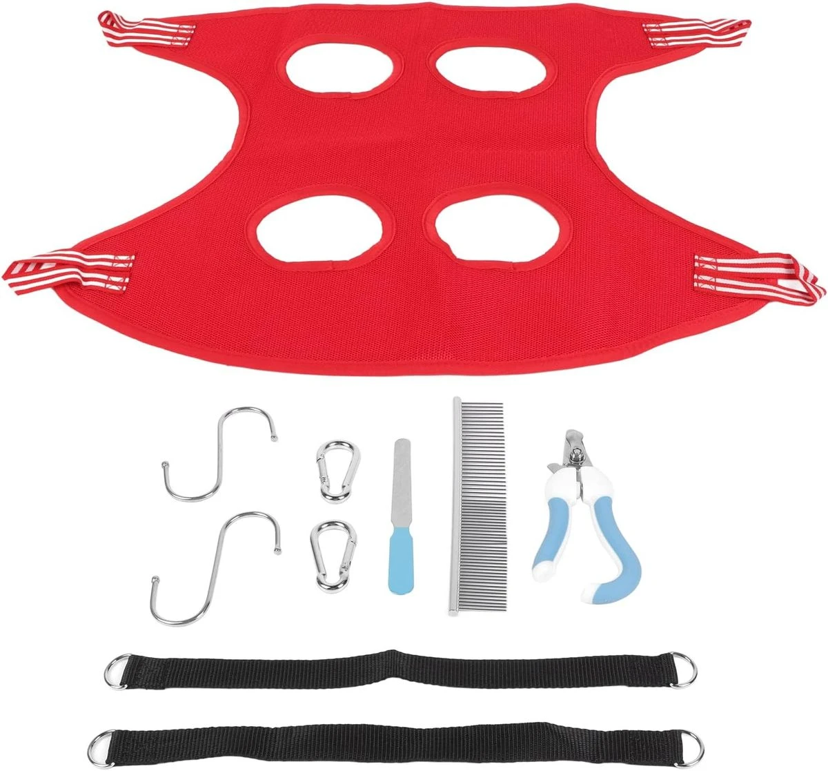 This all-in-one grooming package includes everything you need to start grooming your pet at home. Our kit includes a pet hammock with 2 carabiners, 4 S-hooks, and 2 hammock hanging straps, a deshedding comb, nail clippers, a nail file, and hair removal gloves. Get peace of mind with our reinforced double-stitched seams and breathable air mesh fabric to relax your pet and make grooming a positive experience. Get grooming done quickly without worrying about how to safely hold your pet or risk injury and increased stress. Stop spending money on expensive grooming sessions for your pet and do it in the comfort of your own home. Pets are calmer in familiar environments, and when you use the pet hammock, the grooming process is quick, easy, and affordable. The pet hammock creates an easy solution to all your grooming problems; no need to make appointments and transit pets; if you're on the road, the pet hammock travels easily for quick grooming anywhere, anytime. Made of premium material for durable use, it is convenient and practical. With small size and lightweight design, it won't take up much space. Easy to use, just put the dog's paw in the hole and around. What's in the box 1 x Pet Grooming Supplies |