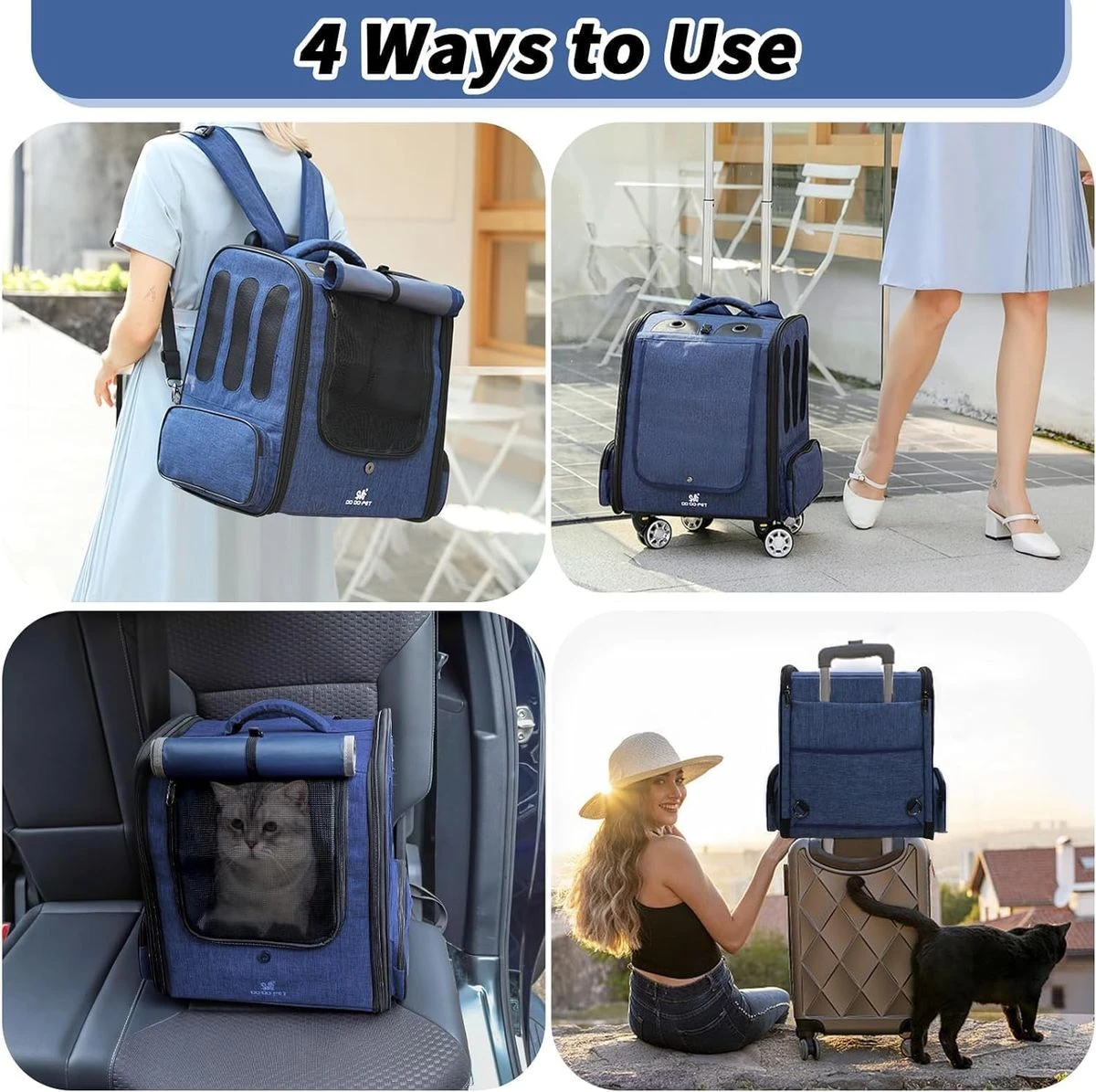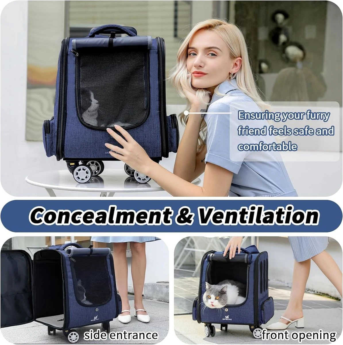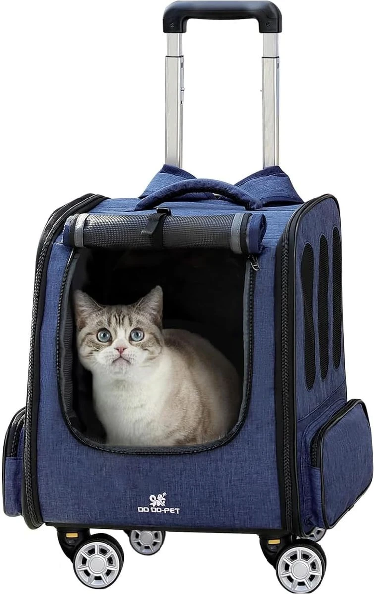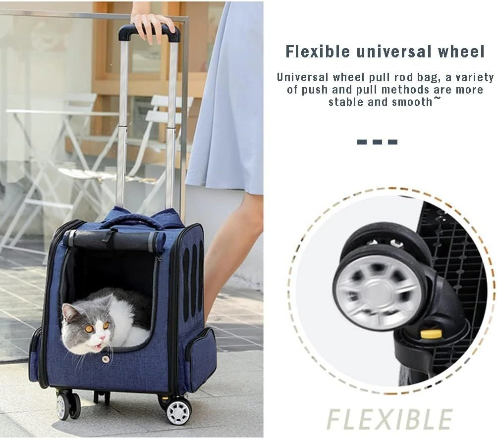 Give your furry baby a comfortable travel experience with our pet rolling backpack. The spacious interior ensures ample room for your furry friend to move around, while the soft padding provides extra comfort. Make your furry friend feel right at home during the journey. The dog carrier backpacks for small dogs 10 lbs with wheels features an adjustable roller blind at the front, allowing for ventilation and breathability when rolled up. The large mesh window on the front provides continuous airflow, making it suitable for curious cats, dogs, and other small pets while enhancing comfort during use. The discreet design of lowering the roller blind is more suitable for timid pets, providing warmth, shade, and privacy. Our dog travel backpack with wheels features a lightweight design that can be used as a pet backpack, placed on top of luggage, or used as a car carrier. It can also be used as a rolling pet carrier, allowing for easy carrying & maneuverability. The stable & sturdy bottom panel, adjustable handle & comfortable grip enable effortless movement of the pet backpack. Whether you're walking or using public transportation, you can easily carry your dog and enjoy the fun of travel. Rolling puppy carrier backpack with wheels has adjustable wide shoulder straps with anti-slip and shock-absorbing design, along with a comfortable back panel lined with sponge for stability and comfort. Zippered pockets on both sides provide convenient storage for small items. The pet rolling carrier backpack on the back features a large pocket for an iPad, an umbrella, pet snacks, and pee pads. Our doggie carrier rolling backpack is equipped with multiple safety measures to ensure the security of your puppy. The double-headed zippers are designed to effectively prevent pets from jumping out. Additionally, the built-in safety rope can be attached to your pet's collar, providing an extra layer of protection to prevent any potential escapes. Guarding your furry friend during travel. What's in the box 1 x Pet Backpack Carrier with Wheels 1 x Grooming Comb 1 x Safety Seatbelt |