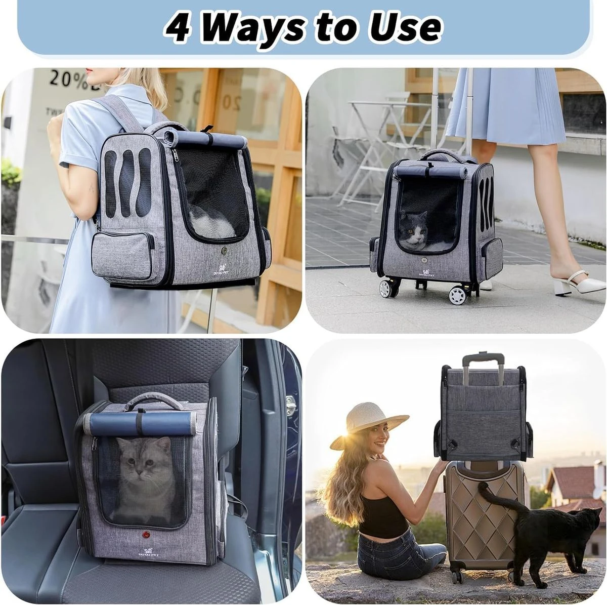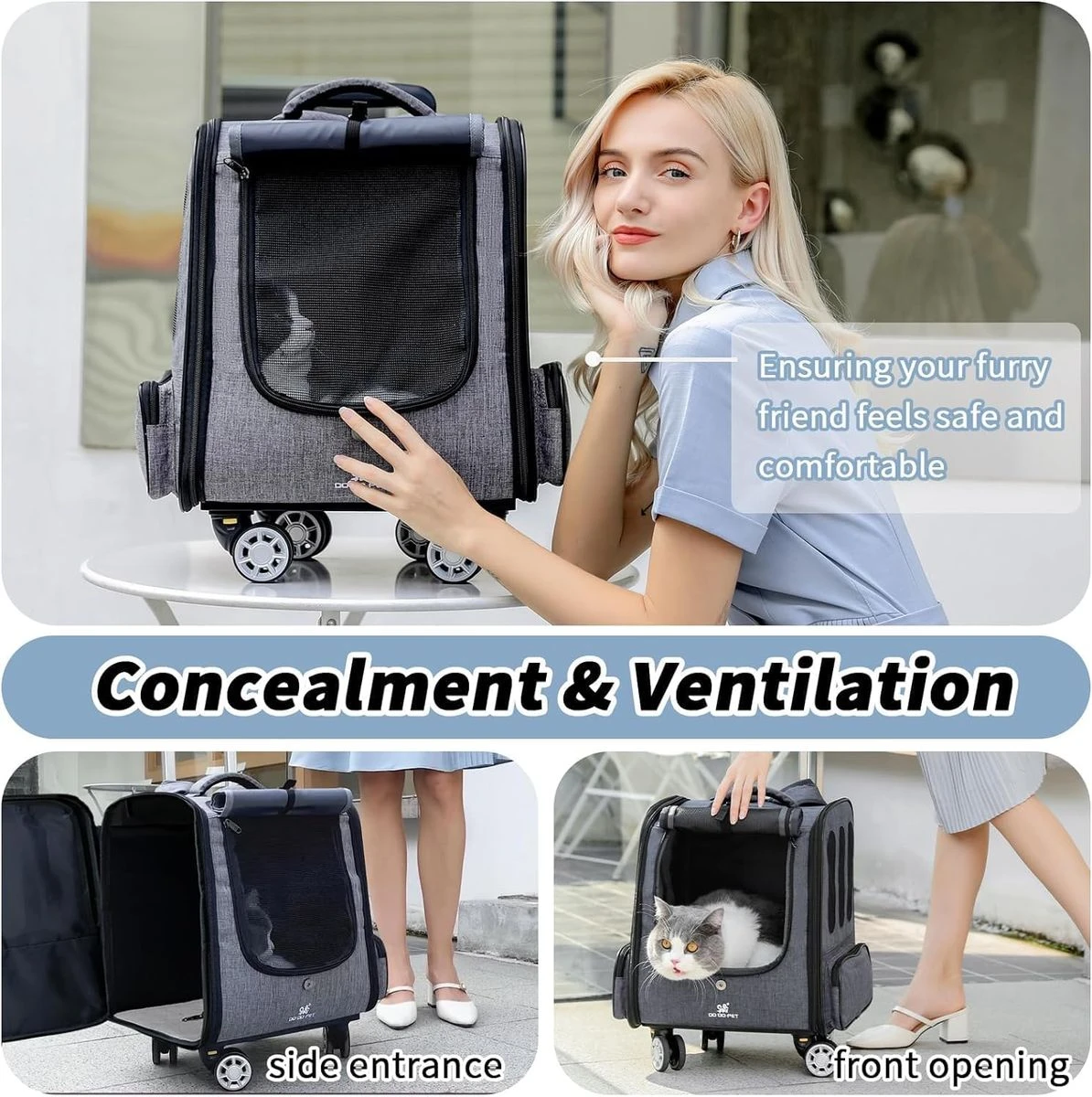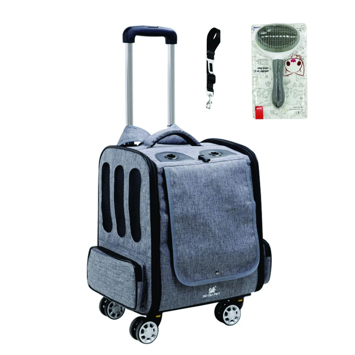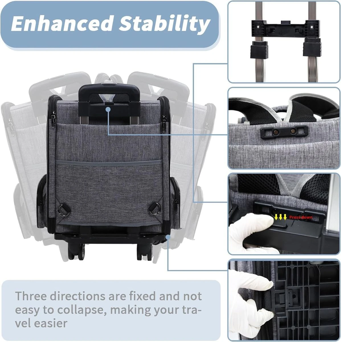 Give your furry baby a cofortable travel experience with our pet rolling backpack. The spacious interior ensures ample room for your furry friend to move around, while the soft padding provides extra comfort. Make your furry friend feel right at home during the journey. The dog carrier backpacks for small dog with wheels features an adjustable roller blind at the front, allowing for ventilation and breathability when rolled up. The large mesh window on the front provides continuous airflow, making it suitable for curious cats, dogs, and other small pets while enhancing comfort during use. The discreet design of lowering the roller blind is more suitable for timid pets, providing warmth, shade, and privacy. Our dog travel backpack with wheels features a lightweight design can be used as pet backpack, placed on top of luggage or used as a car carrier. It can also be used as rolling pet carrier, allowing for easy carrying & maneuverability. The stable & sturdy bottom panel, adjustable handle & comfortable grip enable effortless movement of the pet backpack. Whether you're walking or using public transportation, you can easily carry your dog and enjoy the fun of travel. Rolling puppy carrier backpack with wheels has adjustable wide shoulder straps with anti-slip and shock-absorbing design, along with a comfortable back panel lined with sponge for stability and comfort. Zippered pockets on both sides provide convenient storage for small items. Pet rolling carrier backpack of the back features a large pocket for iPad, umbrella, pet snacks, and pee pads. Our doggie carrier rolling backpack is equipped with multiple safety measures to ensure the security of your puppy. The double-headed zippers are designed to effectively prevent pets from jumping out. Additionally, the built-in safety rope can be attached to your pet's collar, providing an extra layer of protection to prevent any potential escapes. Guarding your furry friend during travel. What's in the box 1 x Pet Carrier 1 x Grooming Comb 1 x Harness Seat Belt |