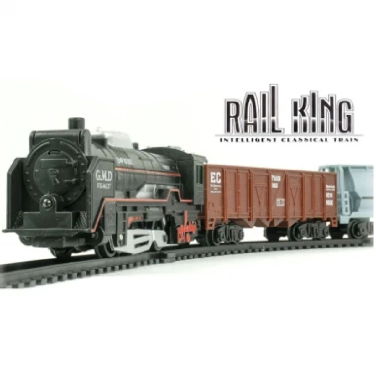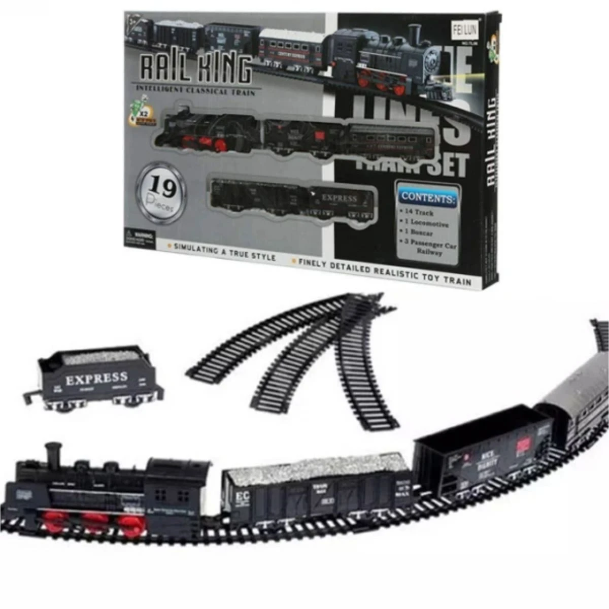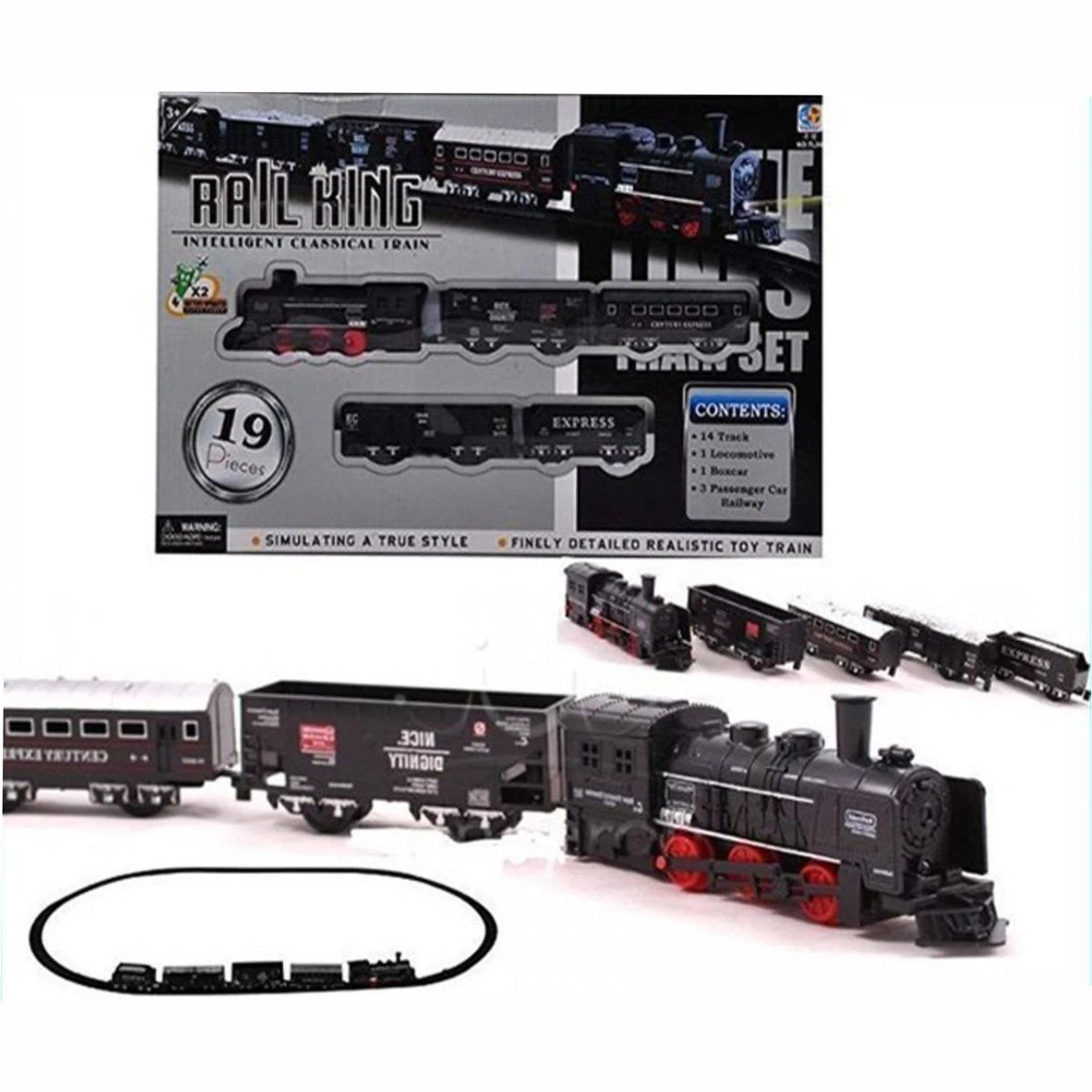 This 19 piece plastic electronic train set contains: - 14 Tracks - 1 Locomotive - 5 Carriages The locomotive requires 2 AA batteries (not included) and will then, once switched on, run the train on the tracks. What's in the box 1 x Rail King 19 Piece Train Set |
