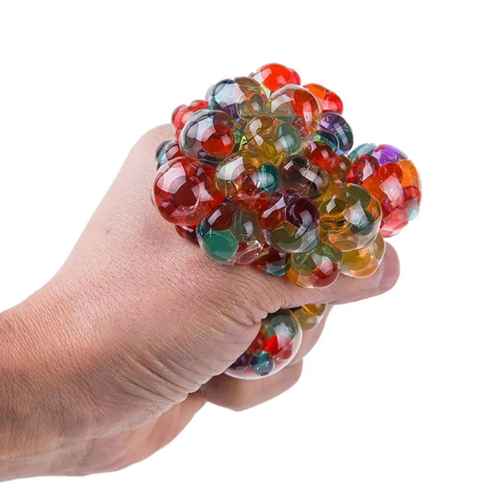 Stress & Anxiety Relief. Have endless hours of fun throwing, squeezing and squishing your Squishy Mesh Ball. As you squeeze the ball, beads grow through the net, allowing you to create super cool shapes! The harder the mesh ball is squeezed, the more bumps appear and the cooler it looks. Have non stop fun with your Mesh Ball, great for keeping the little one entertained for hours. Also, perfect as a stress ball for kids and adults alike. Durable Non-Toxic Rubber Construction Toy Balls Do not pierce the ball or the bubbles. What's in the box 12 x Rainbow Mesh Squish Balls |