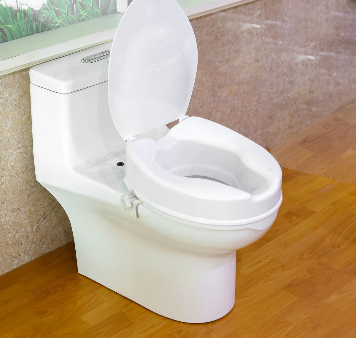 This elevated toilet seat is made for convenience and simplicity; Lightweight and easily portable, can be quickly interchanged and removed as needed; Durable molded plastic; Duel contoured design, four inch lift; Can place over toilet seat. Installation is quick and easy, no tools required; Twist and lock clamps safely secures seat to most round shape toilet rims; Front and back cut-out contour indentation allows for maximum hygiene and easy reach when wiping. Seat Height 4 inches (10 cm); Seat Width 14 (36 cm) side to side, Seat Depth 16 inches (40.5 cm) front to back; Weight Capacity: 100Kg; Included toilet seat lid for privacy. Made with medical grade materials to hospital standards; An excellent choice for seniors, limited mobility users, assisted living caregivers, the disabled, or those recuperating from hip fracture, back, lower body surgery, strains, muscle injury PCP 4" Raised Standard Toilet Seat, Increase Height Over Commode, Includes Lid, Tightening Stability Safety Clamps What's in the box 1 x Raised Toilet Seat with Lid |
