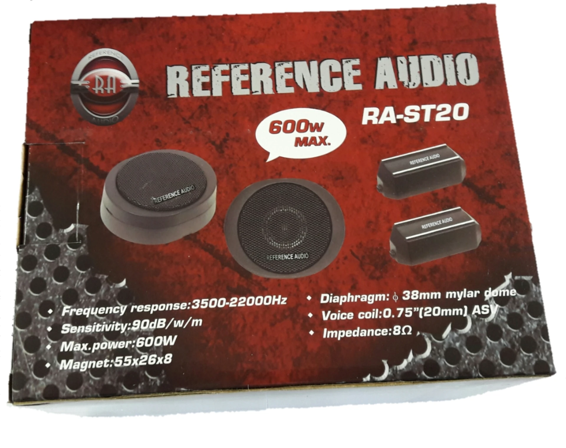 20MM Super tweeters 600W Power output Nominal power - 100W Titan dome tweeter 2.5 OZ Strontium magnet Sensitivity- 92DB AT 1X-1M 2X Crossover included 1 Year Warranty Reference Audio Tweeter RA-TS20This audio system features powerful 20mm super tweeters, delivering crisp and detailed high-frequency sounds. With a robust 600W power output and a nominal power of 100W, it promises an immersive audio experience. The presence of a titan dome tweeter and a substantial 2.5 OZ strontium magnet enhances the precision and depth of the audio output. The sensitivity of 92dB at 1X-1M ensures that the speakers efficiently convert power into sound, making them suitable for various applications. Additionally, the inclusion of 2x crossovers adds versatility, enabling optimal frequency distribution for improved audio performance. Whether you seek high-quality audio for music or a dynamic sound experience for movies, these specifications highlight a speaker system designed for powerful and clear audio reproduction. |