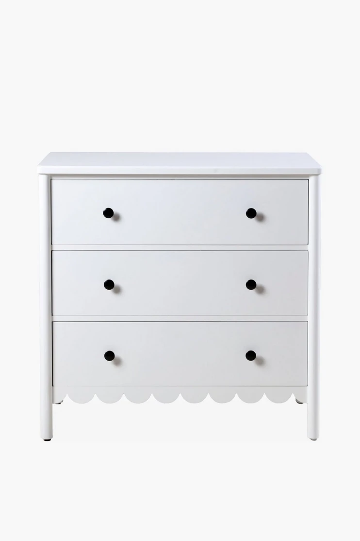 This 3 drawer unit is a stylish choice for a modern room settiing finished in Duco White. The scalloped design element adds a timeless look.