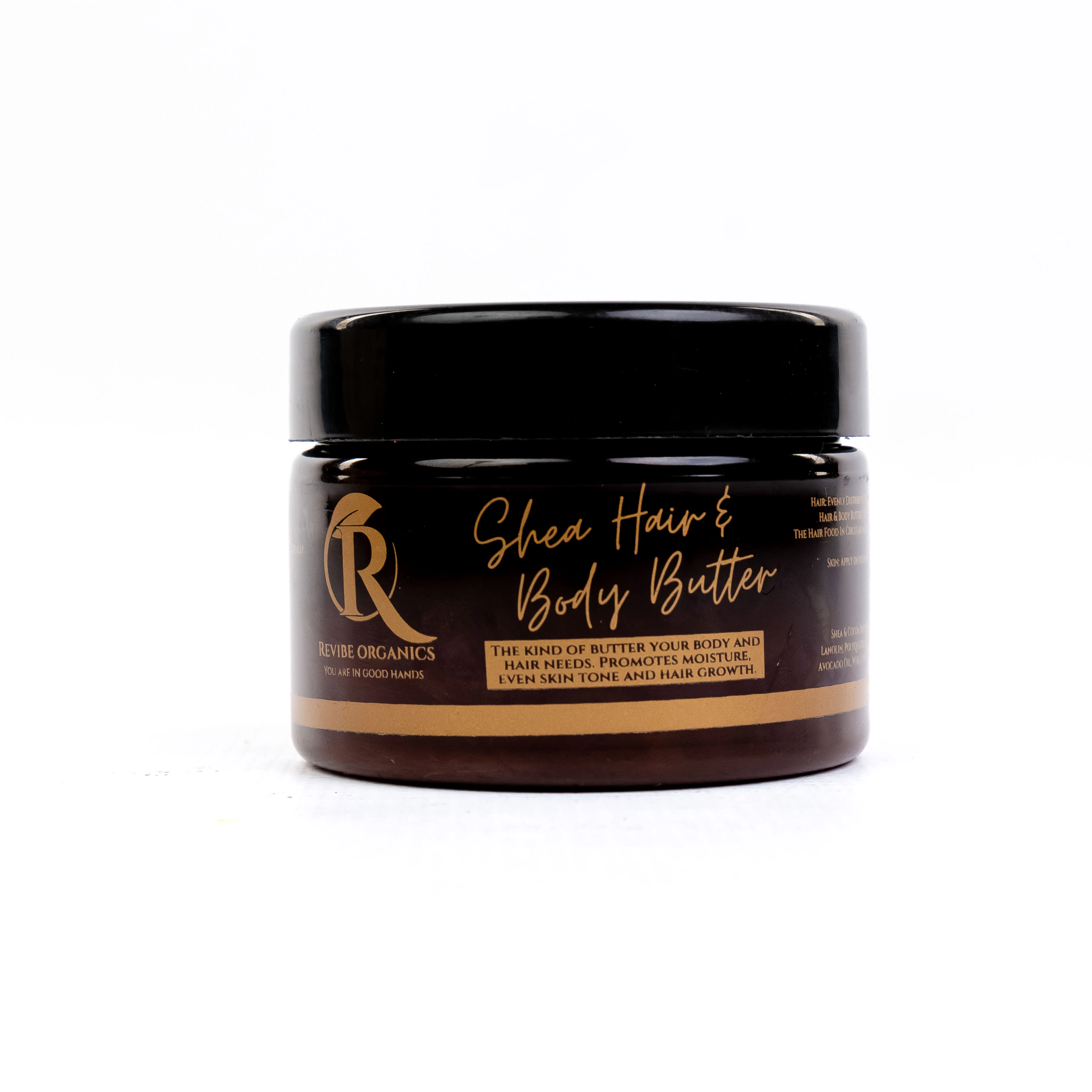 Shea Hair & Body Butter Size: 250ML Deeply Nourishing. Multi-Purpose. 100% Natural. Revibe Organics Shea Hair & Body Butter is a rich, ultra-moisturizing blend of organic shea and cocoa butter, designed to hydrate, soften, and protect both skin and hair. Infused with nourishing oils and plant-based actives, this butter helps restore elasticity, smooth texture, and lock in long-lasting moisture. Perfect for dry skin and natural hair, it promotes a healthy, even skin tone while also supporting stronger, healthier hair growth. A luxurious, all-in-one daily essential for head-to-toe nourishment. How to Use Shea Hair & Body Butter