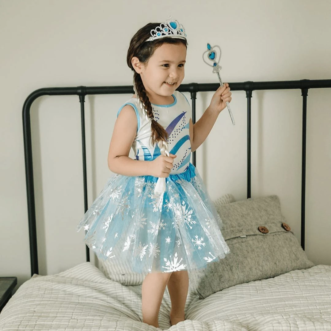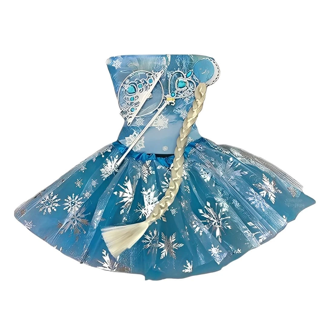 Complete 4-piece princess dress-up set including snow-themed tutu dress, tiara, wand, and clip-on ponytail Beautiful icy blue design with shimmering snowflake details for a magical winter look Lightweight, comfortable tutu dress with stretchy waistband for easy wear and movement Sparkling tiara and matching wand to complete the royal princess style Easy clip-on braided ponytail for instant costume transformation Perfect for dress-up play, themed parties, birthdays, and school character days Encourages imaginative play, creativity, and confidence Reusable costume set suitable for multiple occasions and celebrationssa inspired tutu set What's in the box 1 x Tutu Skirt, wand, crown and hair piece. |