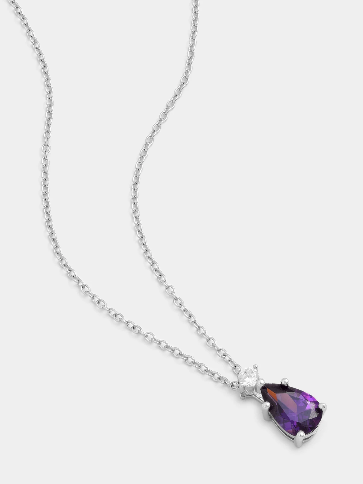 Expertly crafted in Sterling Silver, this beautiful pendant on a chain features a pear-cut amethyst-coloured Cubic Zirconia adorned by a round-cut white stone. Gemstone Amethyst Material composition Sterling Silver Length 42cm Fibre content SILVER Stone colour PURPLE Material colour Rhodium Plated |