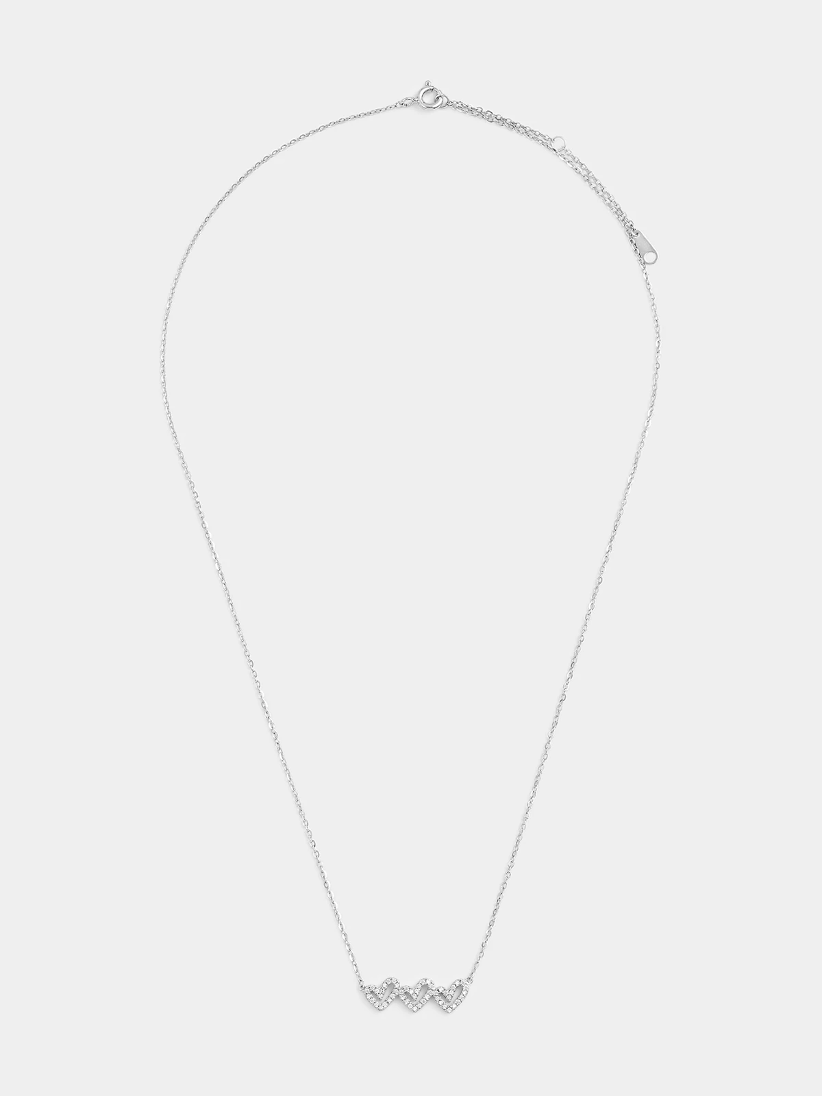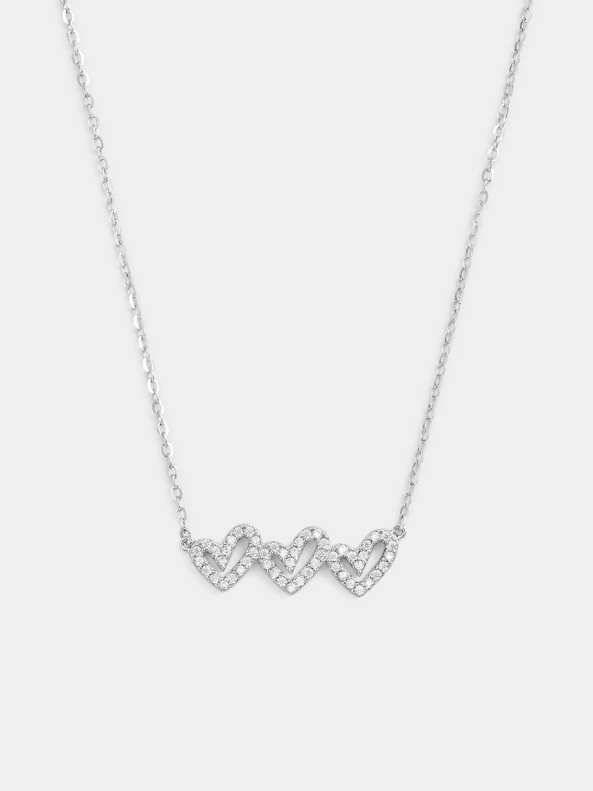 Expertly crafted in Sterling Silver, this romantic necklet features a triple heart design glittering with pavé set Cubic Zirconia. Gemstone Cubic zirconia Material composition Sterling Silver Length 45cm Fibre content SILVER Stone colour Clear Material colour Rhodium Plated |