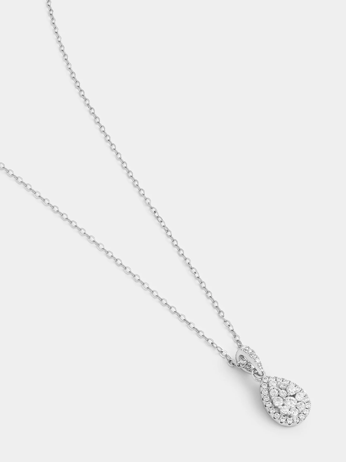 Expertly crafted in Sterling Silver, this beautiful pendant on a chain features a pear-shaped cluster of round-cut Cubic Zirconia. Gemstone Cubic zirconia Material composition Sterling Silver Length 45cm Fibre content SILVER Stone colour Clear Material colour Rhodium Plated |