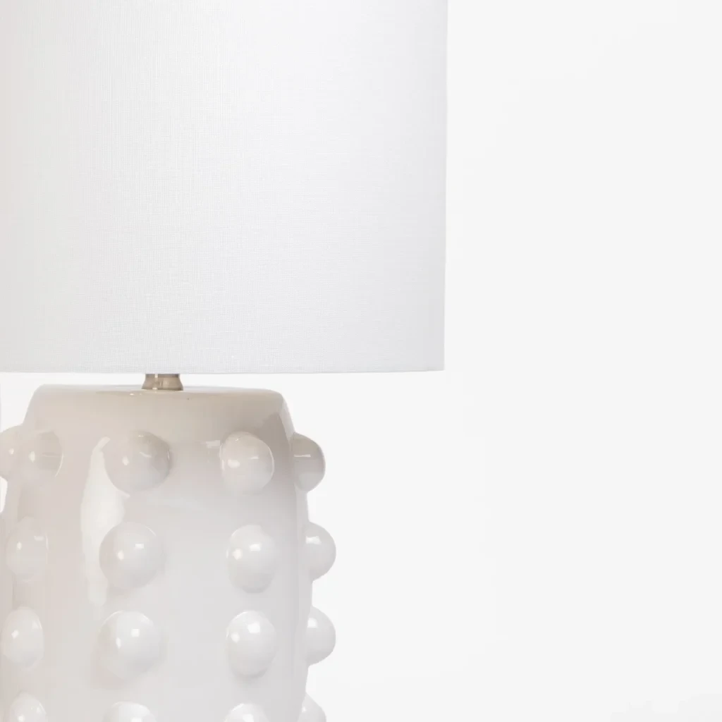 Crafted with a tactile ceramic base finished in crisp white, this table lamp features a playful dotted texture that adds subtle pattern and charm. Topped with a matching white fabric shade, it casts a warm, calming glow perfect for bedside tables, dressers or reading nooks. A stylish blend of tone-on-tone texture and soft lighting for modern or coastal interiors. |