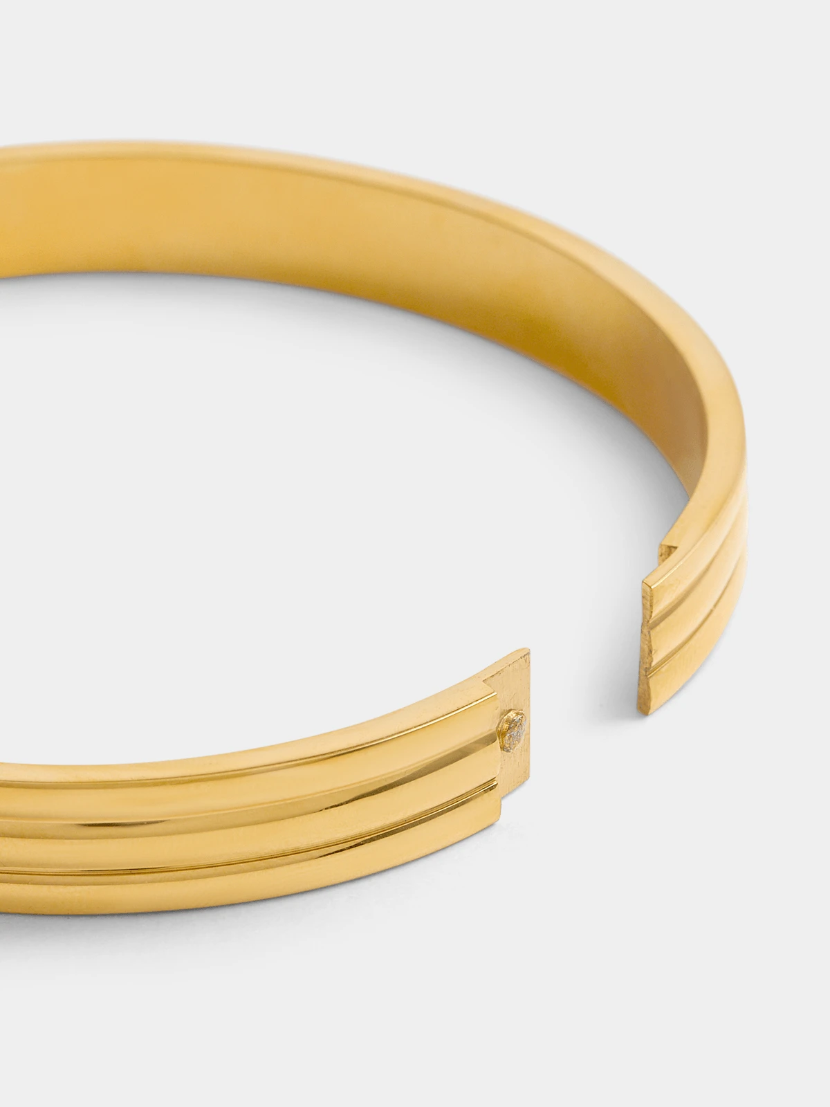 Expertly crafted in Gold Plated Stainless Steel, this stylish grooved bangle catches the light with pavé set Cubic Zirconia. All Tempo Jewellery is hypoallergenic, waterproof and durable, boasting a 1-year guarantee. Gemstone Cubic zirconia Material composition Stainless Steel Fibre content STAINLESS STEEL Stone colour Clear Material colour Yellow Gold |