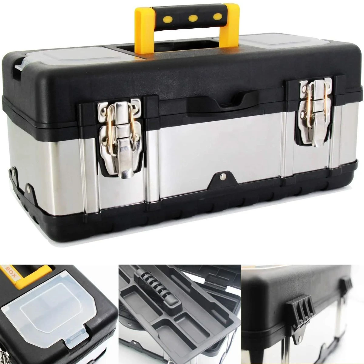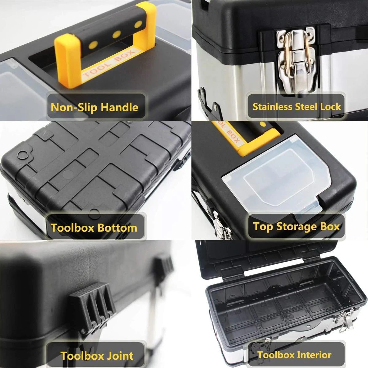 Solid Construction: This toolbox is made of thick stainless steel and superior ABS, which ensures the tool box durable and sturdy. A good choice for carrying power tools, hand tools, and medium items. Ample Storage Space: Features an interior organizer tray, and provides ample storage space. The top storage box can store small parts, easy to find and avoid loss. Also, it is equipped with a bottom compartment, which can hold large, heavy items. Safety Design: It is dirt-resistant. Diamond shape design makes it unique and fashionable. This box also features a metal Stainless steel lock: more secure, safe and durable, Safety lock: safety consolidation, and child protection Extra Protection: Besides the durable material, this box is surrounded by plastic, which can avoid wear and tear. It will not dent or rust like a traditional steel toolbox and the material won't mar other surfaces. Easy To Carry: With the lightweight design, this tool kit can be carried easily no matter wherever you go. And the comfortable grip handle on top allows for handy portability. high quality stainless steel The sides of this GANCHUN 16-Inch metal toolbox are designed with thickened stainless steel, which can be more durable and sturdy. This tool organizer also features metal stainless steel locks which can be used for safety consolidation and child protection. base protection The sturdy bottom consists of superior ABS materials, ensuring the toolbox longer service time. A rigid and waterproof plastic base can be sure that your tools remain safe and dry, and it also features abrasion resistance. large capacity storage There are multiple compartments, including a bottom compartment, an interior organizer tray and two exterior small storage spaces, allowing for effortlessly organizing a wide range of tools and accessories. What's in the box 1xTool Box Stainless Steel Consumer Storage |