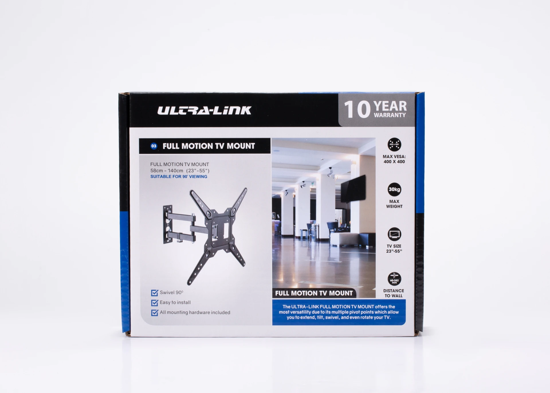 Fits screens ranging from 23" to 55" Maximum weight capacity of 30kg Impressive tilting range of +3° to -10° Sleek and modern design Aesthetically pleasing TV securely mounted to the wall 10 Year Warranty Ultra-Link 23-55 inch Full Motion TV BracketTransform your living space with the Ultra-Link 23-55 inch Full Motion TV Bracket, designed to fit screens from 23" to 55" and support up to 30kg securely. Its sleek black finish and modern design bring a stylish touch to any room while keeping your TV safely mounted on the wall. Enjoy perfect viewing angles with an impressive tilt range of +3° to -10°, making movie nights and gaming sessions more comfortable than ever. This bracket offers peace of mind and lasting quality. |