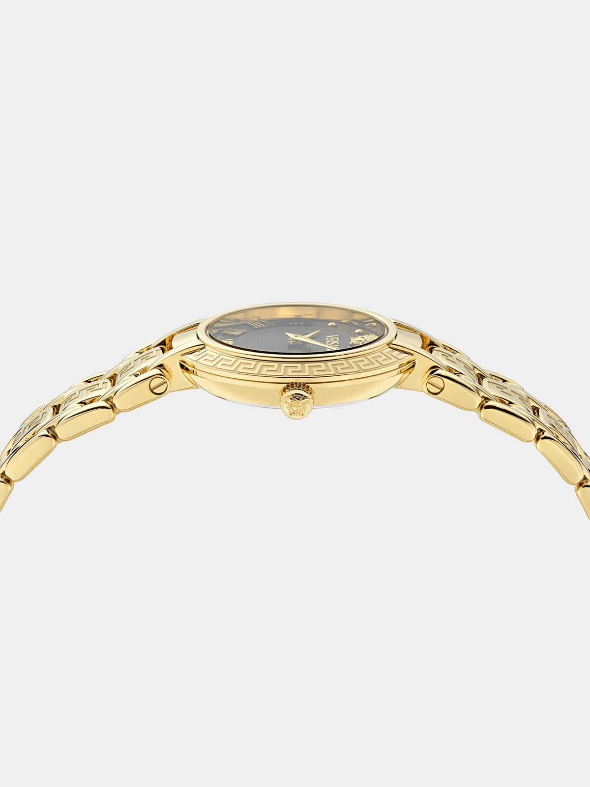 This collection is the perfect for those who love the iconicity of the brand, thanks to the Greca pattern on the top ring and bracelet, but that care to embrace a timeless and elegant style. Watch dial shape Round Material composition Stainless Steel Fibre content STAINLESS STEEL Waterproof Water Resistant Dial colour Black Strap colour Gold Material colour Gold Plated Watch case size 34mm Dial shape Round |