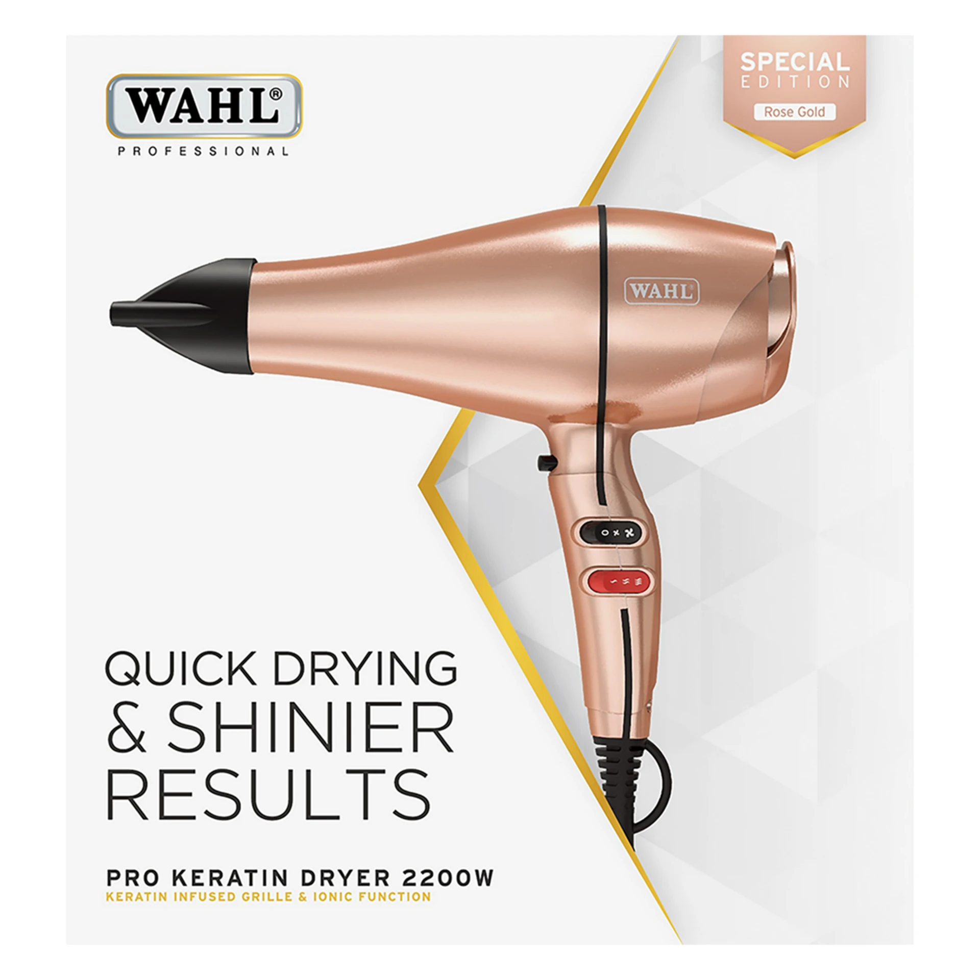 Power - 2200W Reach - 3m cord length Ionic dryer reduces static and frizz 3 heat, 2 speed settings Cold shot included Wide and narrow concentrator nozzles Keratin-infused grill locks in moisture Wahl Pro Keratin Rose Gold HairdryerAchieve salon-quality shine faster with 2200W of power. The keratin-infused tourmaline grille evenly distributes heat, locking in moisture for lasting shine. Integrated ionic tech eliminates frizz & flyaways, making the Pro Keratin⢠your ultimate styling tool. |